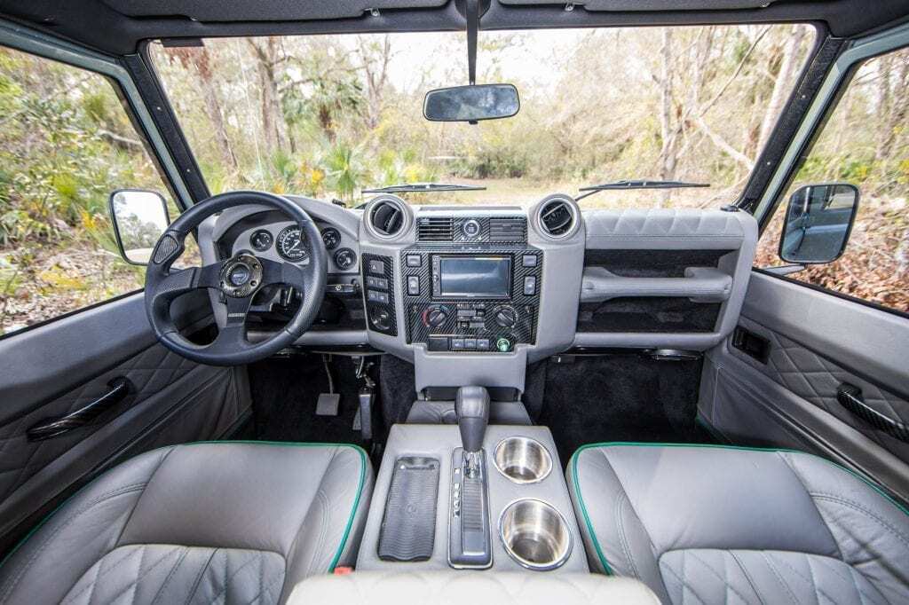 As highlighted on StreetTrucks, this ECD restoration also has a stunning interior that features Caressa Silver Touch leather, the MOMO PROTOTIPO steering wheel, and the Puma Defender Dash. The dashboard on this Defender features a touchscreen Kenwood eXcelon with CarPlay, Bluetooth, WiFi, a wireless charging station, four USB charging ports, and an audiophile-quality Infinity Kappa sound system.