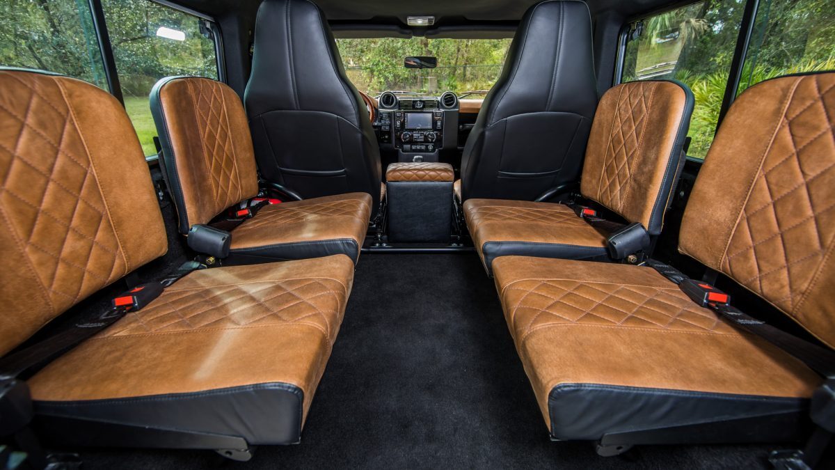 The agile two-door classic defender is the smallest of the defender wheelbases but still has a ton of options for seat layouts. However, the small defender can still seat more than other two-door SUVs on the market today. Starting with the standard two front seats, most of your options will come from the rear layout. You can opt to seat an additional two passengers with two captain seats, a single rear bench seat, or two folding jump seats for the best of both worlds. If you need seating for more than 4, you can also opt for two rear bench jump seats or four rear jump seats for a total seating capacity of 6 individuals. The jump seats don’t leave much room for knee space but can easily be folded up to make room for storage if you need more space than seats. You can also just have two front seats and leave the rear empty for storage.