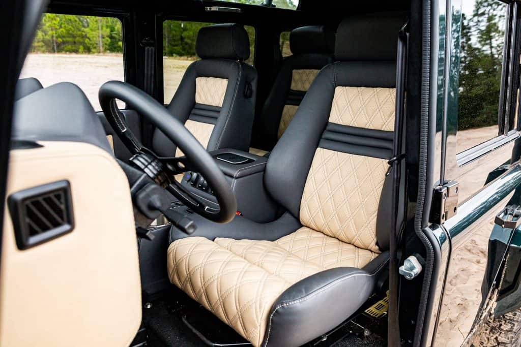 This popular classic defender offers the most seat layout options available. Like the other builds, you can opt for just two front seats, but the max capacity for the D110 is a whopping ten individuals. This is one of the highest seating capacities for a 4-door SUV and off-road vehicle. For this option, you’d have two front seats and four inward-facing jump bench seats, and again, knee space is limited, but the entire family plus friends can enjoy the ride. The most popular seat configuration for the restored defender 110 is usually two front seats, a full middle row that seats three, and either two rear forward-facing captain jump seats or four inward-facing rear jump seats for a total capacity of 7 or 9 seats, respectively. Like with the D90, you can opt to remove a side of rear seats for storage, or like the D130, opt for only seating five and keep the rear for storage. The seating configurations offer a ton of options to fit your needs.