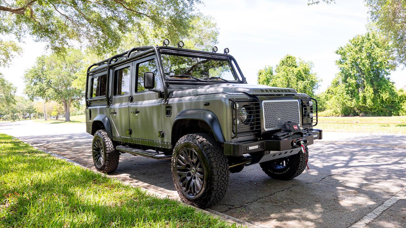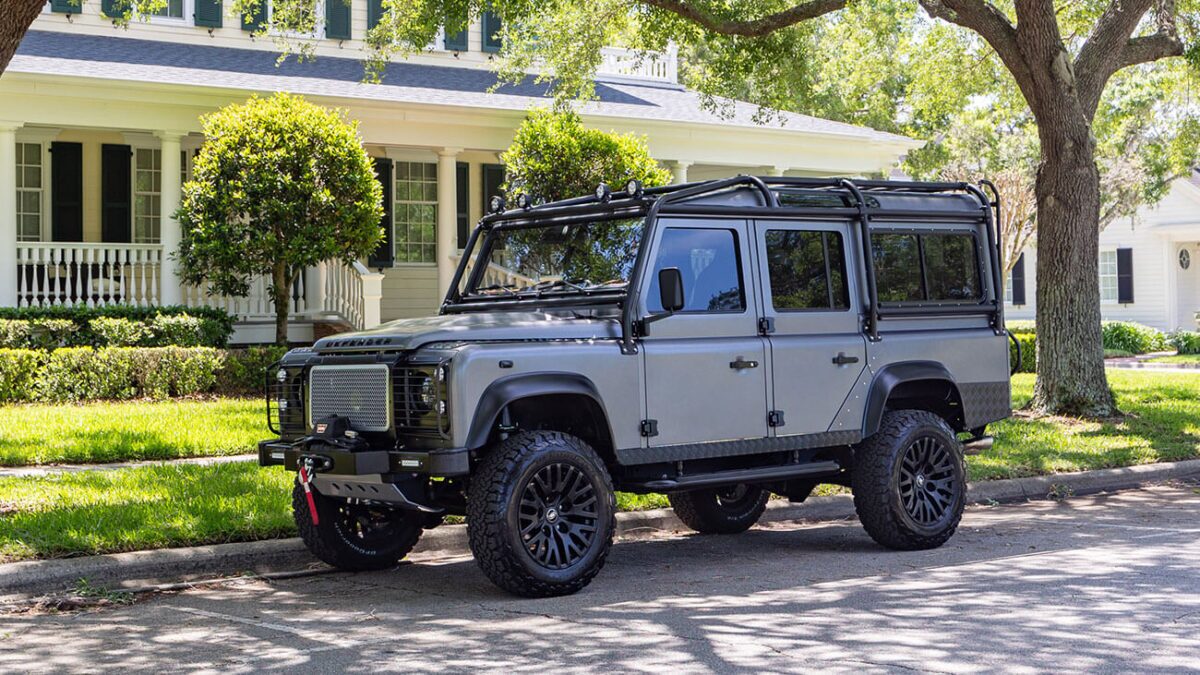 Project SiestaProject Siesta by ECD Auto Design is a one-of-one Defender 110 that found its new home in Georgia. It is powered by a GM LS3 6.2L V8 engine and coupled with a 6-speed automatic transmission. It features heavy-duty stock axles, FAST brakes, and a Fox Off-Road 2-inch lift suspension for enhanced performance. The exterior of this classic Defender 110 showcases a Corris Gray eggshell paint finish, black satin accents, and a body-color grille surround, complemented by 18-inch Kahn satin black wheels and BFG All-Terrain tires. The interior is customized for comfort featuring Corbeau Trailcat front seats, a 60/40 split middle row, and inward-facing jump seats in the load area, all wrapped in black leather with brown mid-section inserts.