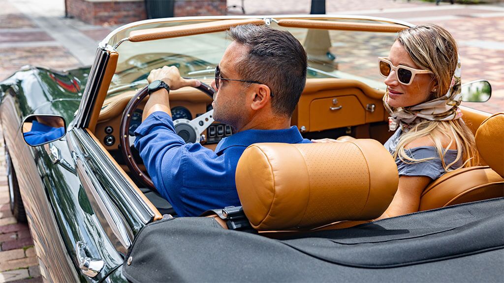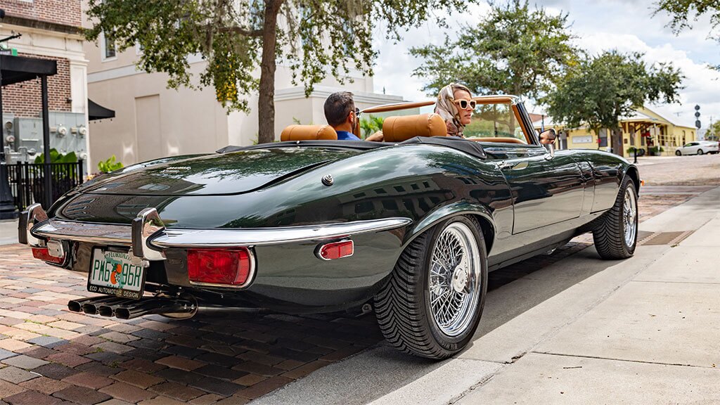 On a scorching-hot Florida highway with co-pilot Tom Humble, Penta drivestop-down in a snarling 1974 Jaguar E-Type. The snarl is emanating not from the car’s original V-12 engine (which purrs more than