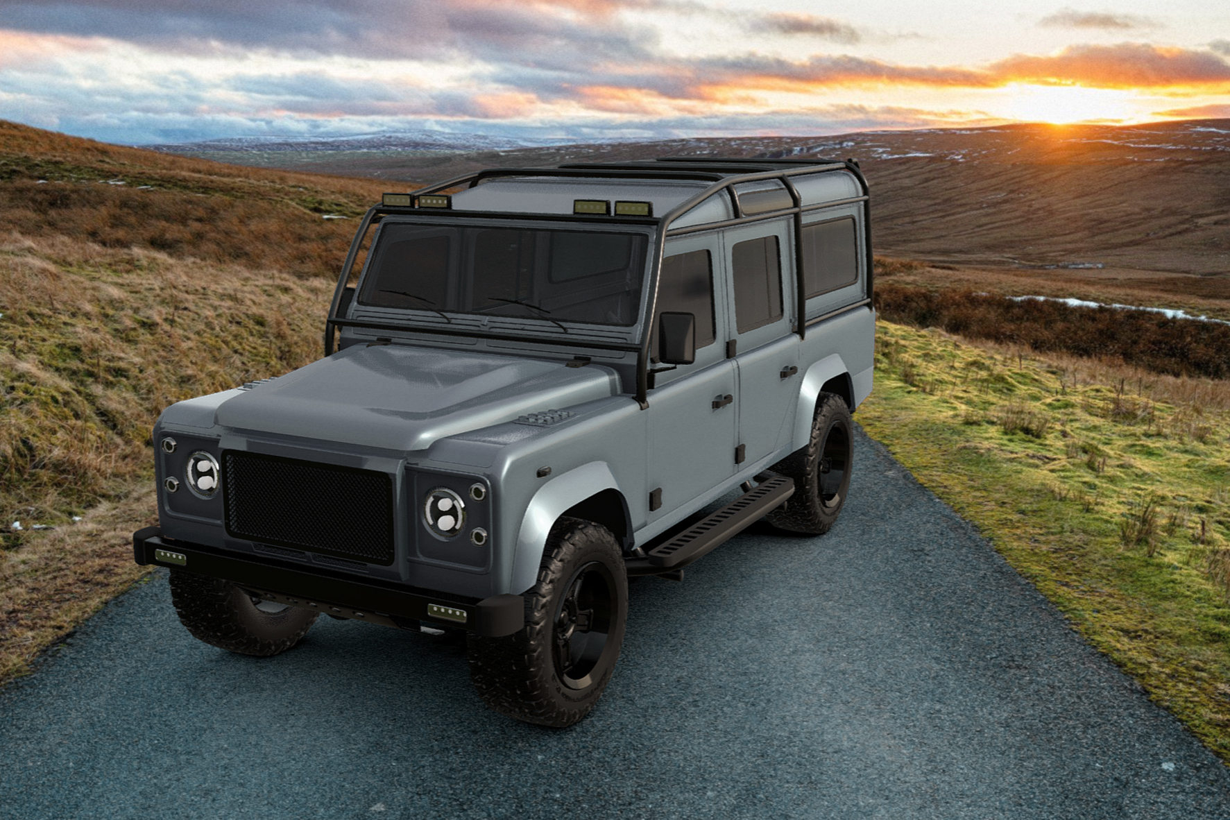 The Warwickshire Defender 110, a bold statement in a stunning Nardo Gray paint, electrifies the landscape with its vibrant energy. Its daring styling, reflects Warwickshire’s rich tapestry of history and innovation, from its medieval castles to its cutting-edge industries. The color mirrors the dramatic skies above the county, while its subtle shifts in tone evoke the beauty of the Warwickshire countryside, where rolling hills meet ancient woodlands. The black interior provides a sophisticated contrast to the exterior’s bold statement, enhancing the overall dramatic effect.