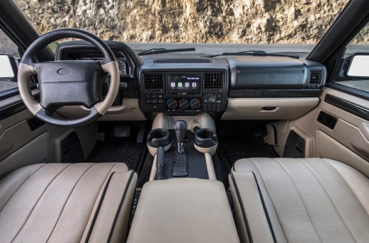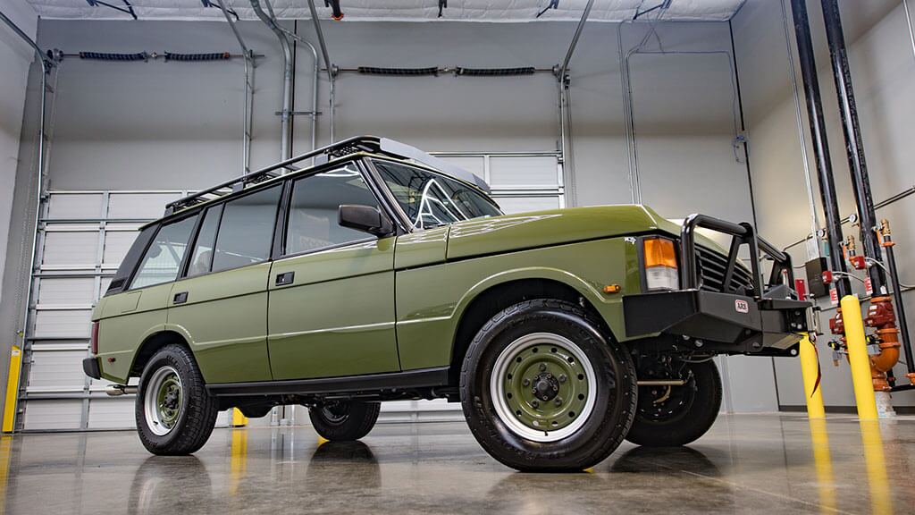 OEM 16-inch Range Rover three-spoke wheels complement the design, while the soft dash interior with a black upper and Forte leather lower section creates a comfortable, modernized environment that retains its vintage character.