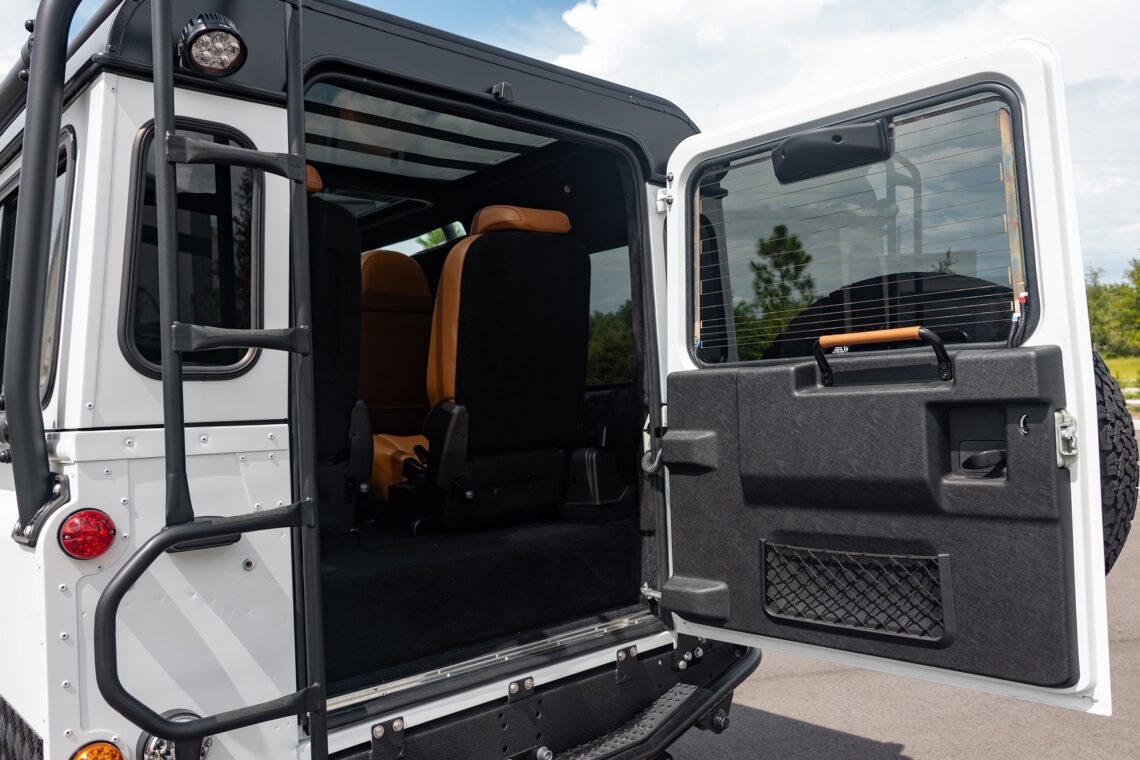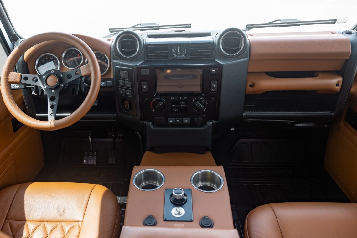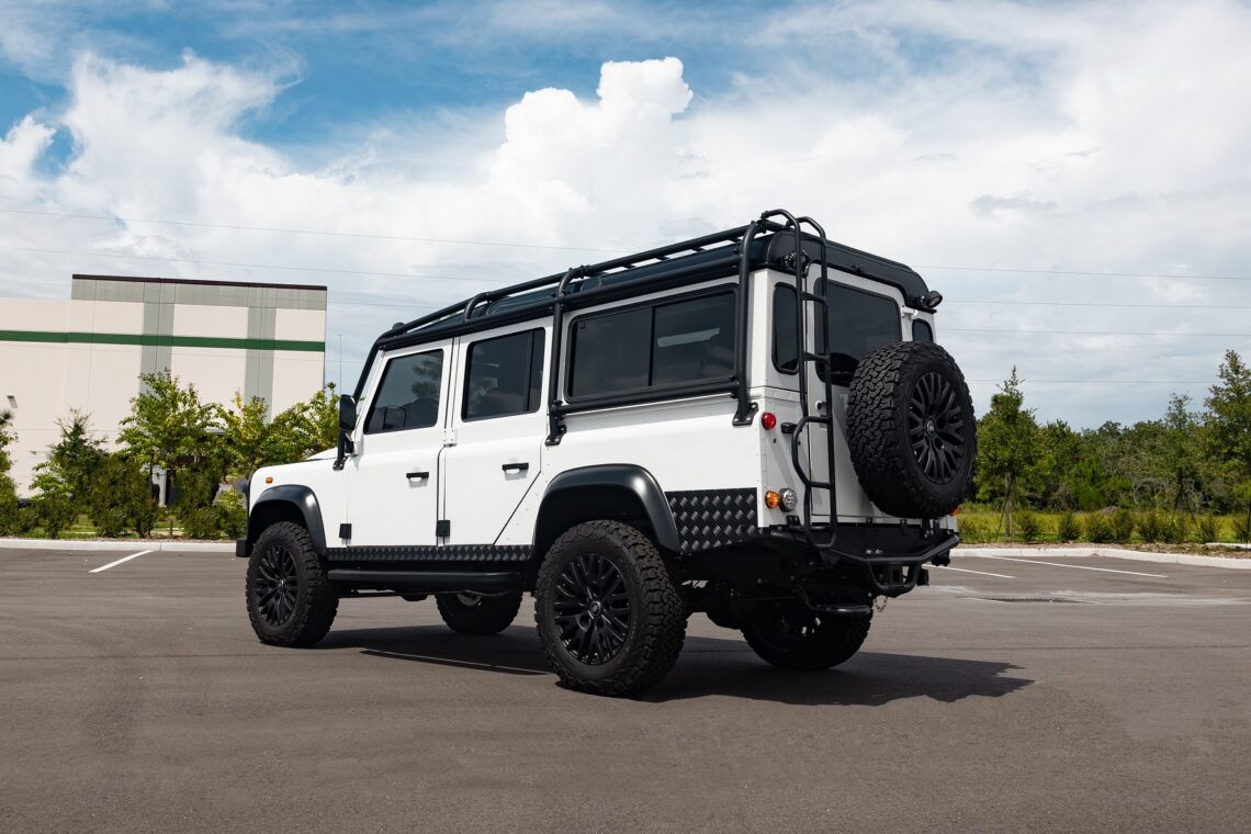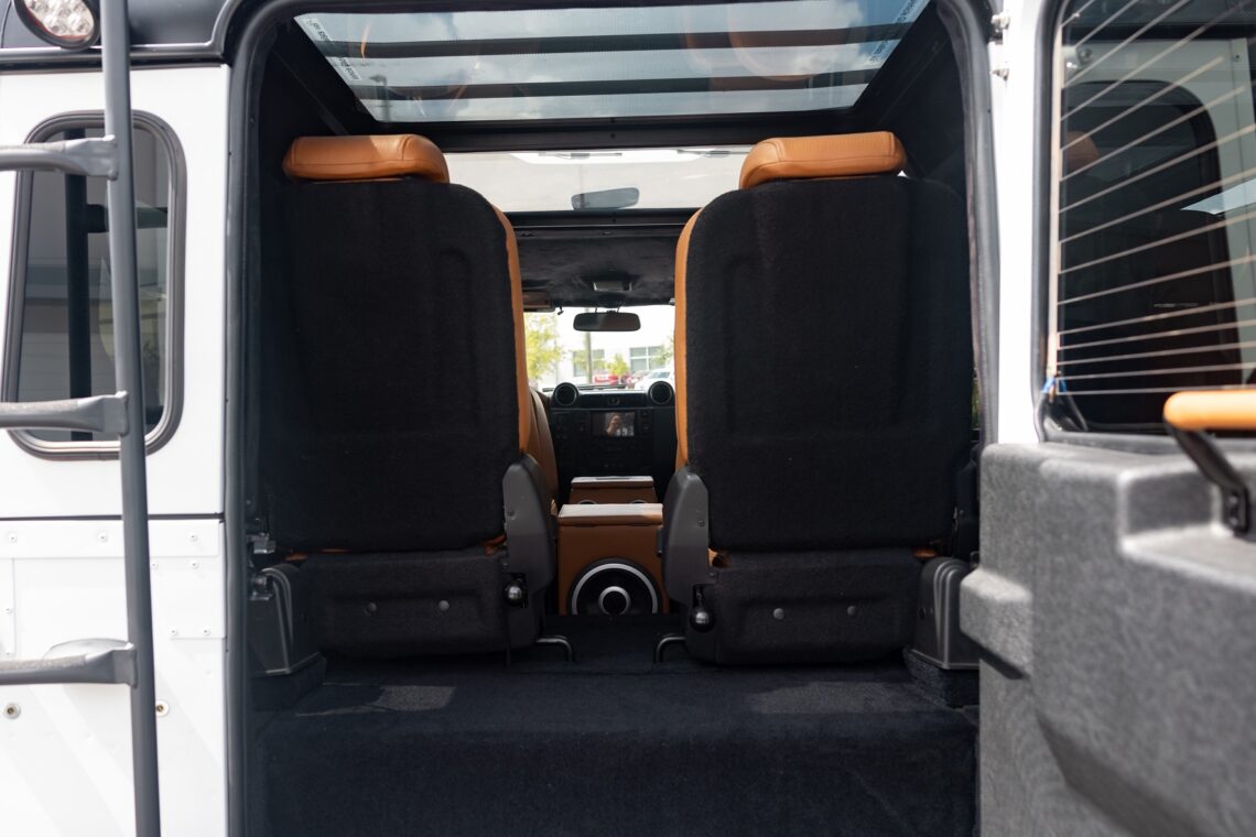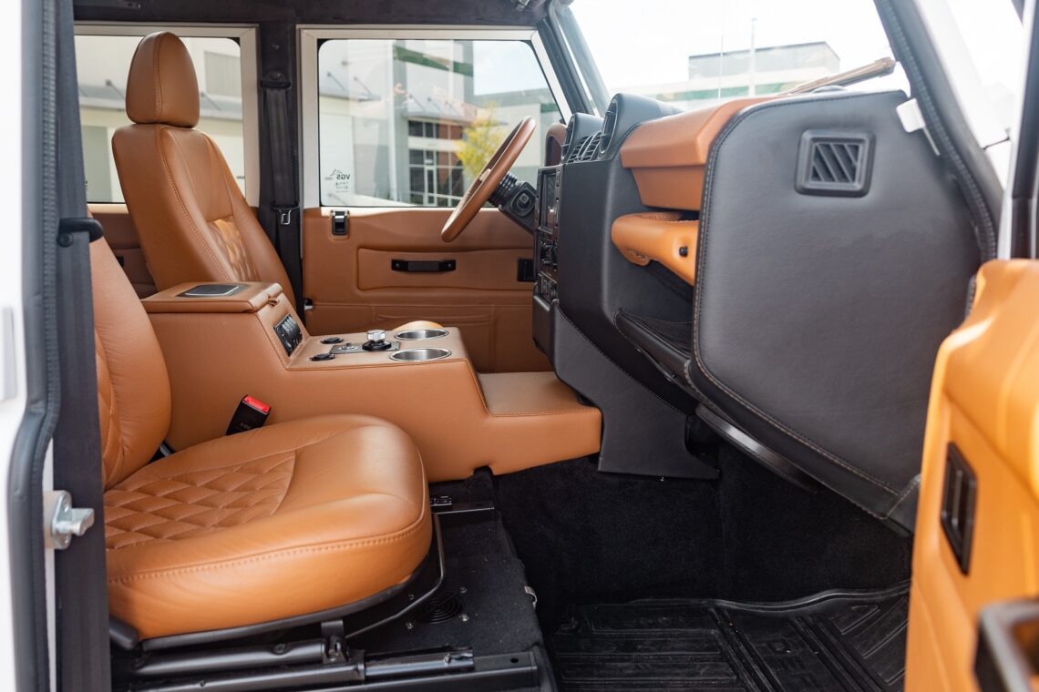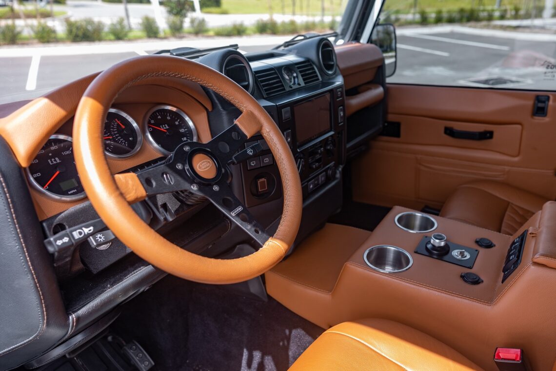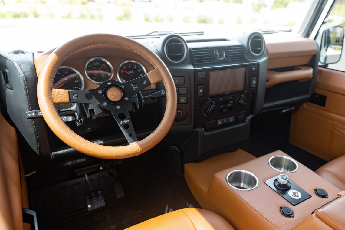 This 1989 Defender 110 is codenamed Project Sunrise. It is powered by our 1st gen EV powertrain. Comes painted in a beautiful Fuji white. It is equipped with our custom Air Ride suspension, ALCON brakes in the front only, OEM style set up in the rear. It also comes with 18 Inch Kahn 1983 wheels painted in Black Satin, fitted with BFG All Terrain tires. The interior features Cadence Licorice leather for the dash, with Cadence Spice accents in some areas. The steering wheel is a MOMO Prototipo wrapped in Cadence Spice leather. It seats up to 6 in a (2+2+2) layout. The front seats are Land Rover Classic style seats, and the load area has 2 forward facing jumps with a rear battery box under the seats. The gauges are custom made for the EV system, and the radio is a Kenwood Excelon head unit. Sunrise comes well equipped with features; such as Apple CarPlay, wireless charging, a back up camera and many more modern features.