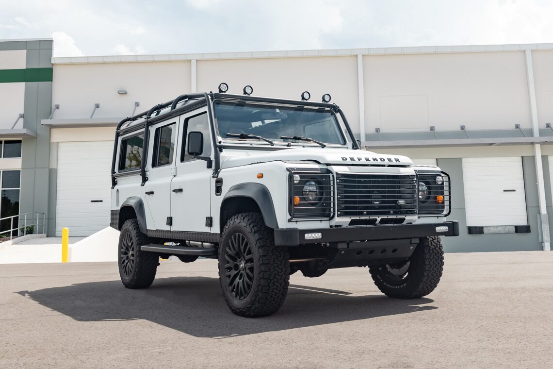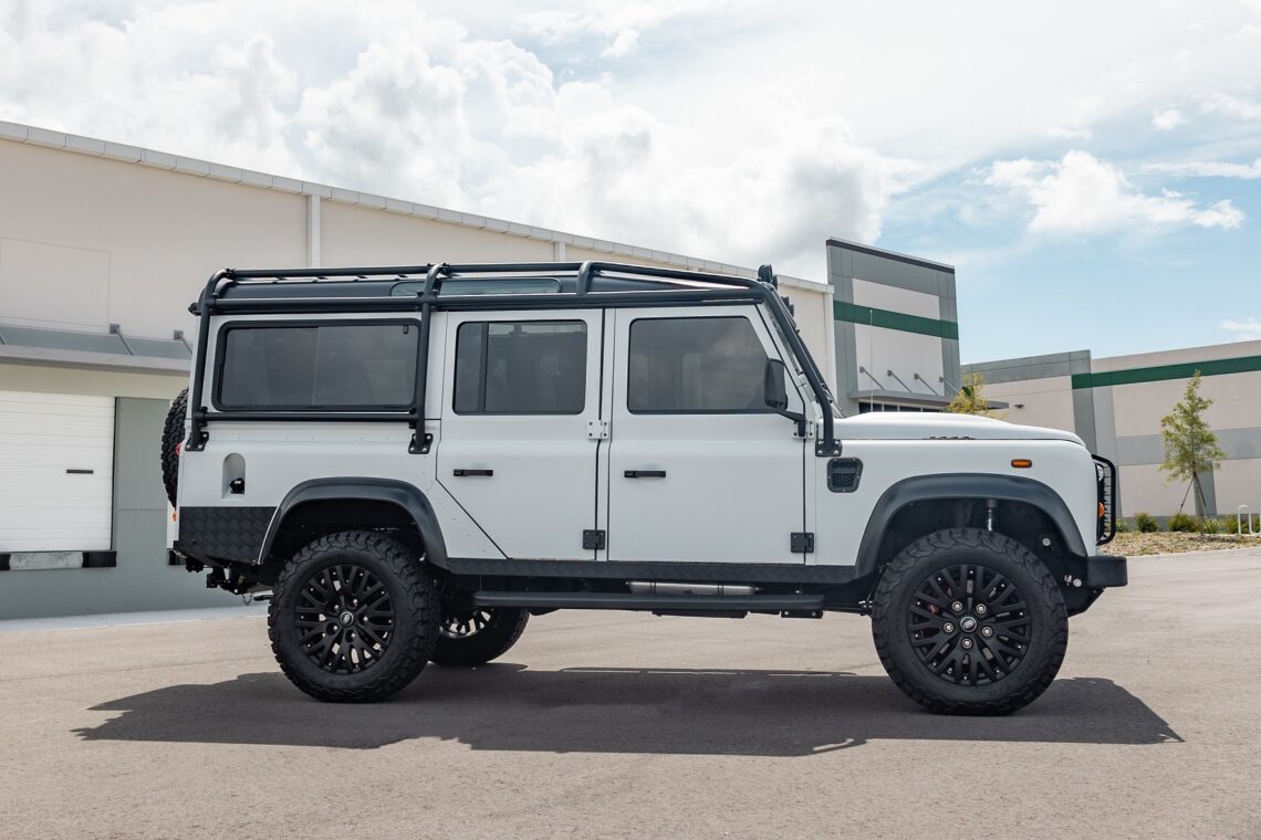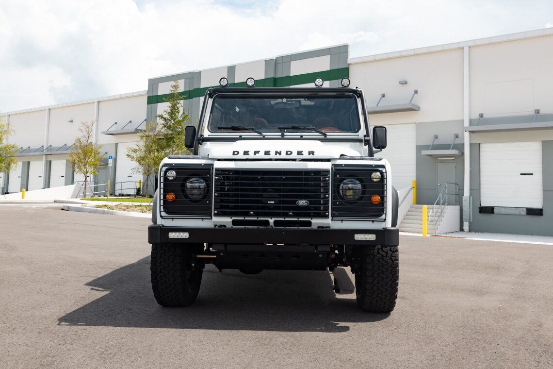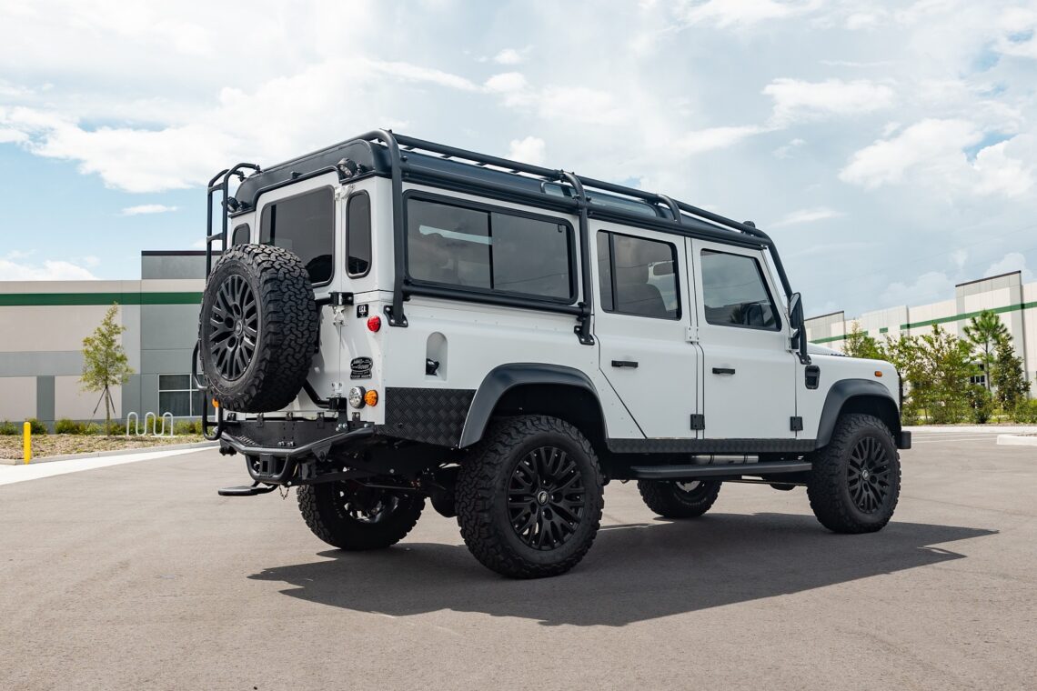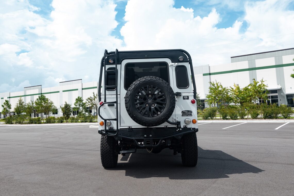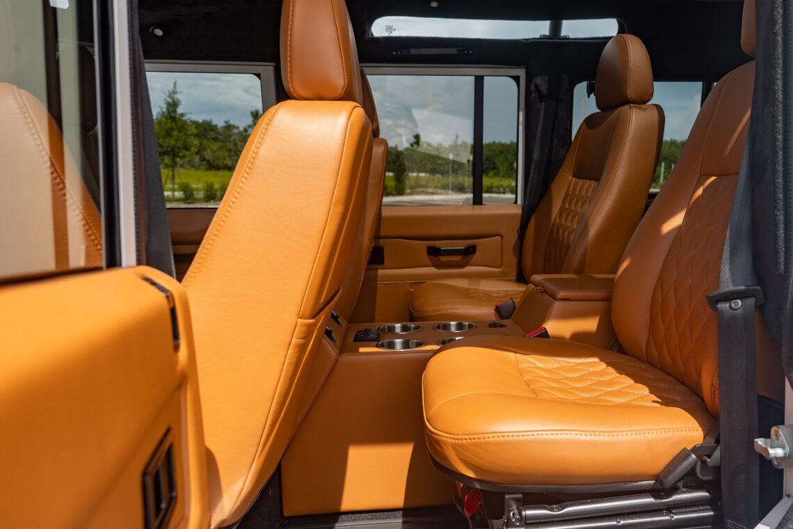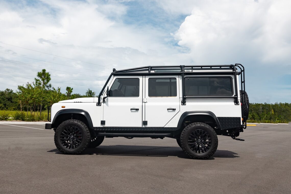 This 1989 Defender 110 is codenamed Project Sunrise. It is powered by our 1st gen EV powertrain. Comes painted in a beautiful Fuji white. It is equipped with our custom Air Ride suspension, ALCON brakes in the front only, OEM style set up in the rear. It also comes with 18 Inch Kahn 1983 wheels painted in Black Satin, fitted with BFG All Terrain tires. The interior features Cadence Licorice leather for the dash, with Cadence Spice accents in some areas. The steering wheel is a MOMO Prototipo wrapped in Cadence Spice leather. It seats up to 6 in a (2+2+2) layout. The front seats are Land Rover Classic style seats, and the load area has 2 forward facing jumps with a rear battery box under the seats. The gauges are custom made for the EV system, and the radio is a Kenwood Excelon head unit. Sunrise comes well equipped with features; such as Apple CarPlay, wireless charging, a back up camera and many more modern features.