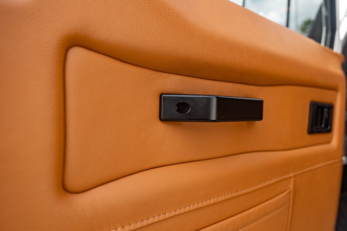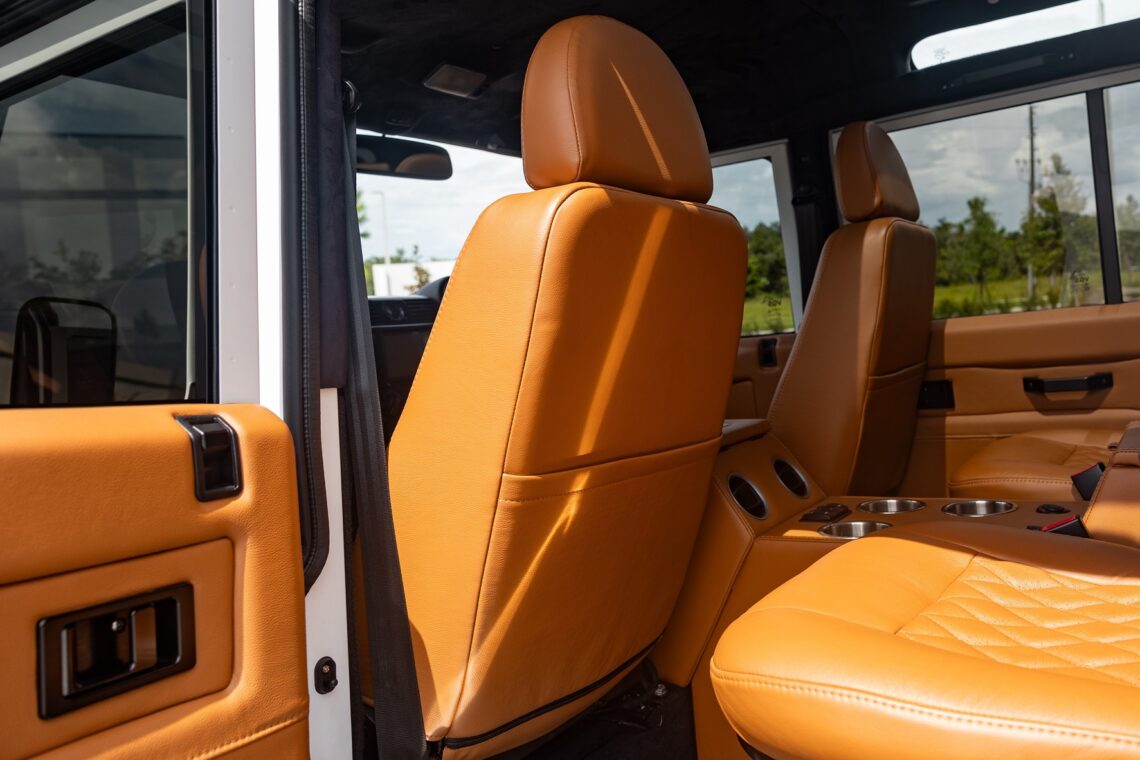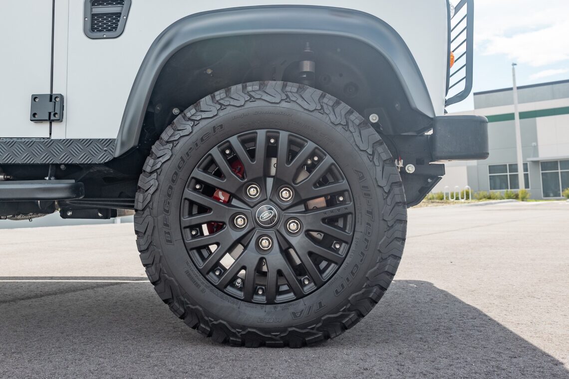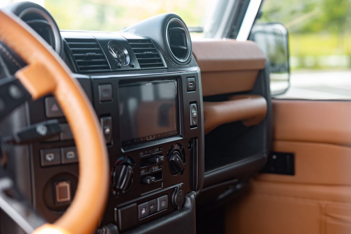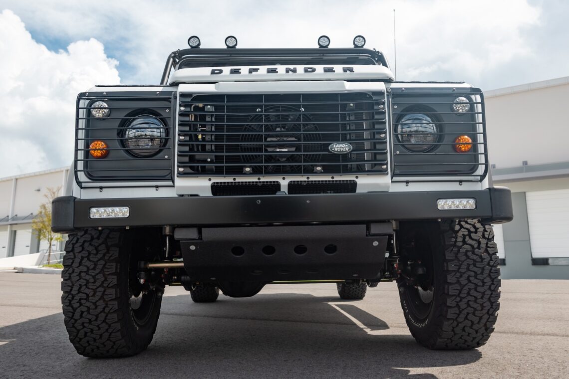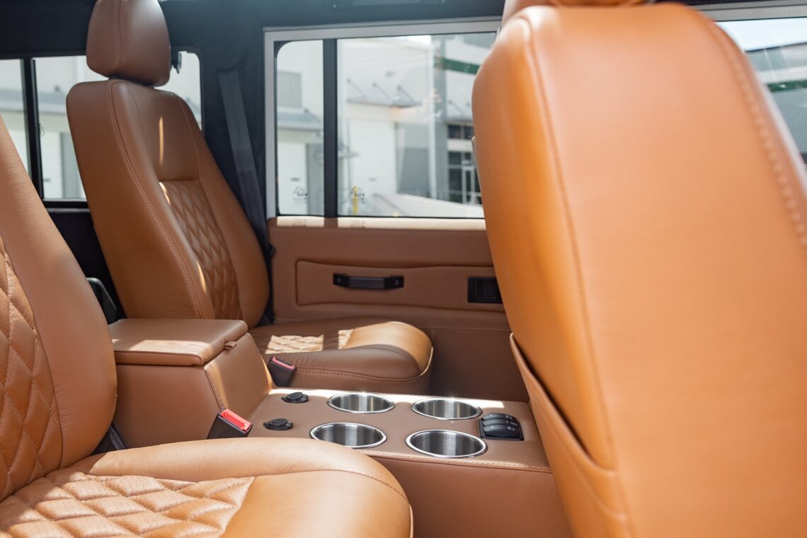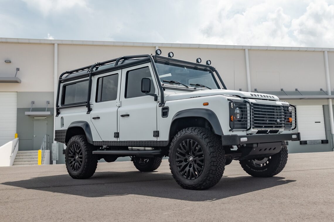 This 1989 Defender 110 is codenamed Project Sunrise. It is powered by our 1st gen EV powertrain. Comes painted in a beautiful Fuji white. It is equipped with our custom Air Ride suspension, ALCON brakes in the front only, OEM style set up in the rear. It also comes with 18 Inch Kahn 1983 wheels painted in Black Satin, fitted with BFG All Terrain tires. The interior features Cadence Licorice leather for the dash, with Cadence Spice accents in some areas. The steering wheel is a MOMO Prototipo wrapped in Cadence Spice leather. It seats up to 6 in a (2+2+2) layout. The front seats are Land Rover Classic style seats, and the load area has 2 forward facing jumps with a rear battery box under the seats. The gauges are custom made for the EV system, and the radio is a Kenwood Excelon head unit. Sunrise comes well equipped with features; such as Apple CarPlay, wireless charging, a back up camera and many more modern features.