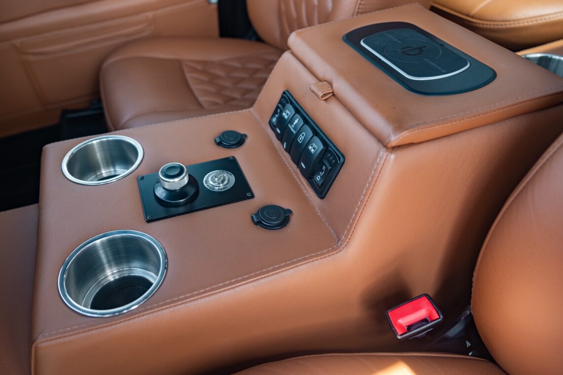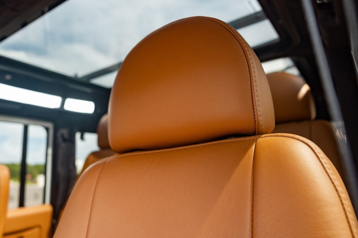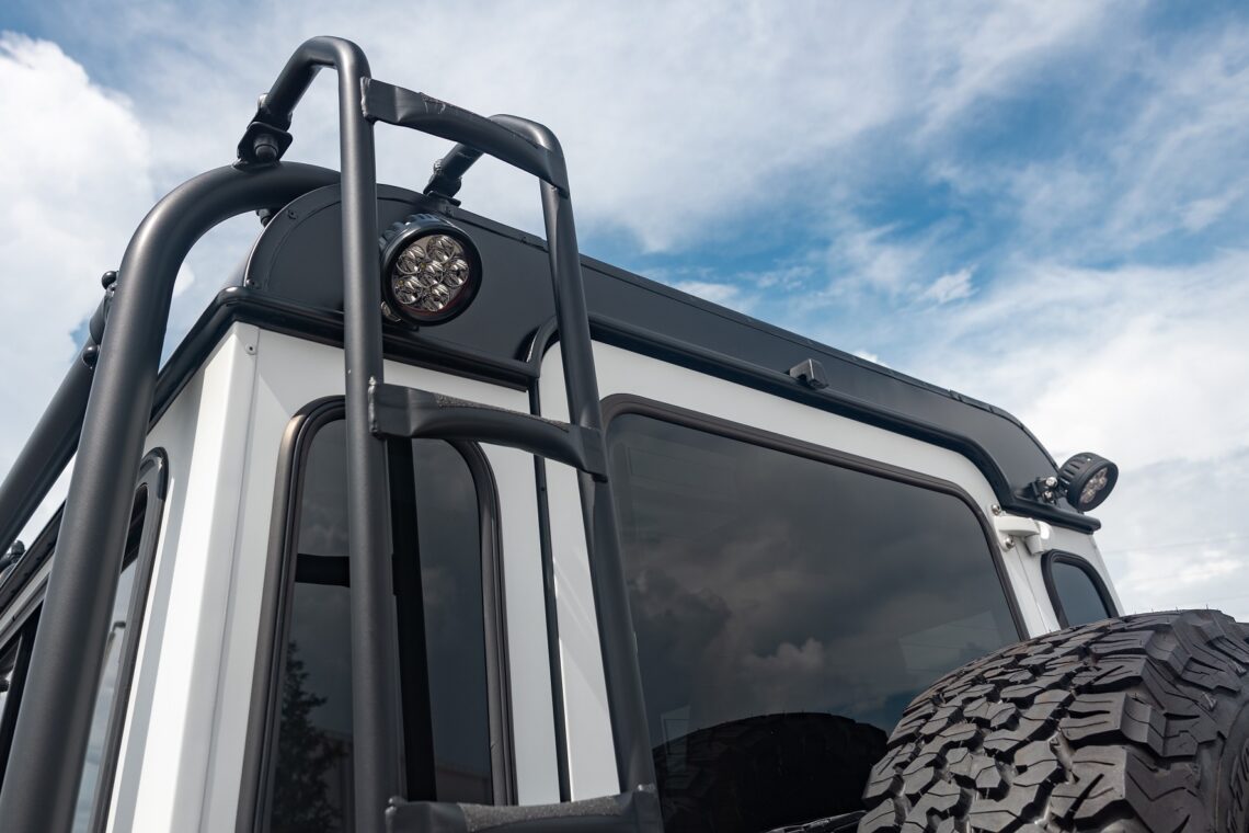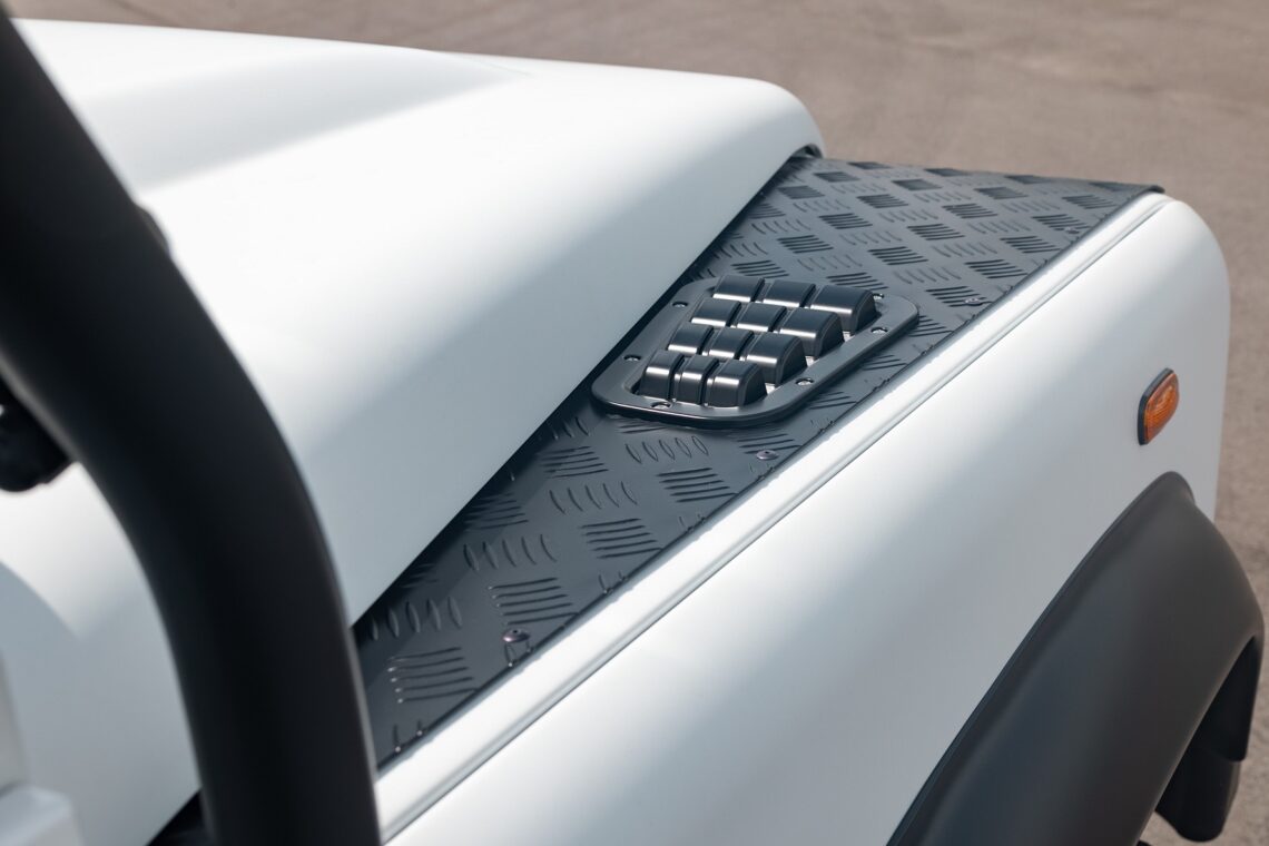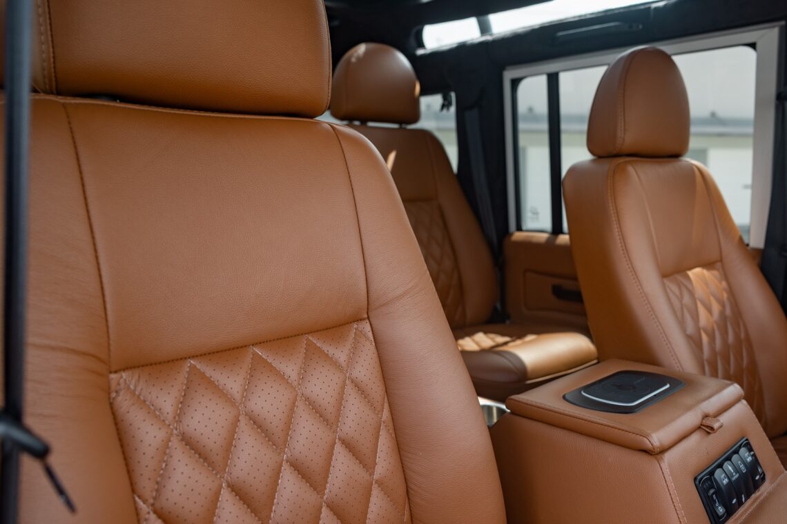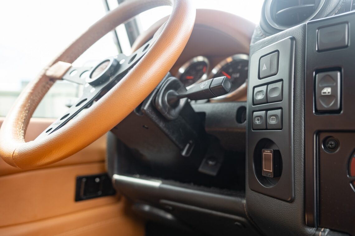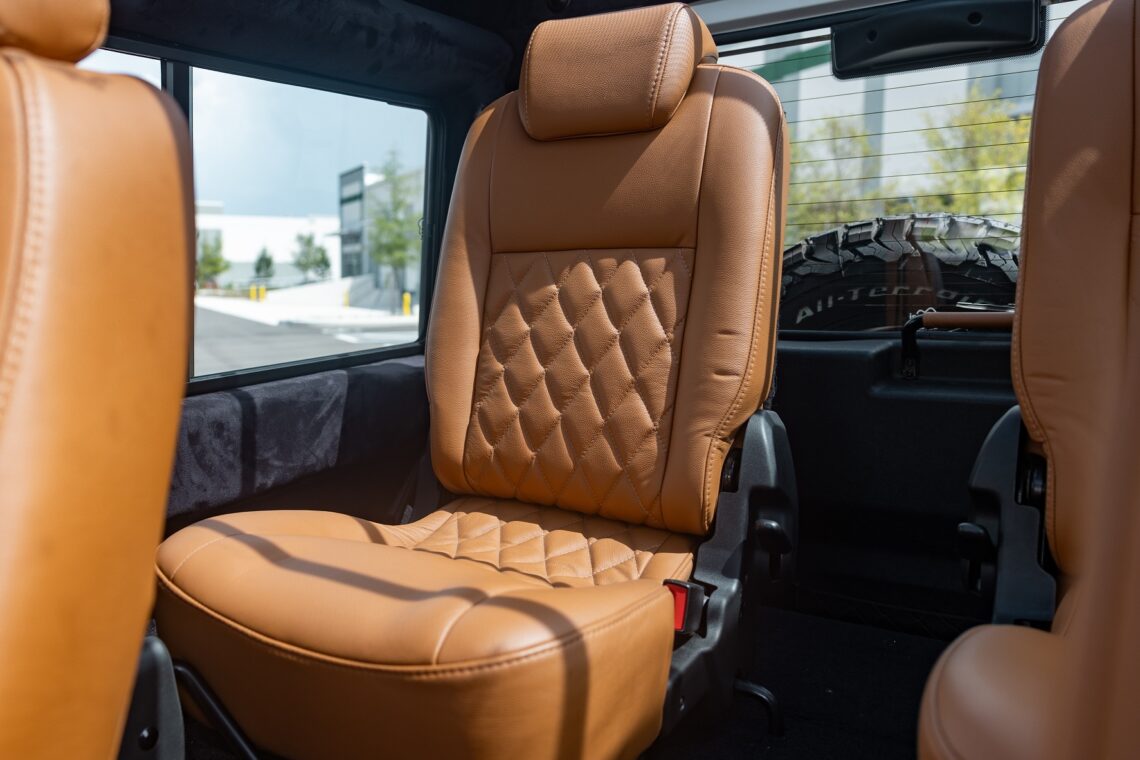 This 1989 Defender 110 is codenamed Project Sunrise. It is powered by our 1st gen EV powertrain. Comes painted in a beautiful Fuji white. It is equipped with our custom Air Ride suspension, ALCON brakes in the front only, OEM style set up in the rear. It also comes with 18 Inch Kahn 1983 wheels painted in Black Satin, fitted with BFG All Terrain tires. The interior features Cadence Licorice leather for the dash, with Cadence Spice accents in some areas. The steering wheel is a MOMO Prototipo wrapped in Cadence Spice leather. It seats up to 6 in a (2+2+2) layout. The front seats are Land Rover Classic style seats, and the load area has 2 forward facing jumps with a rear battery box under the seats. The gauges are custom made for the EV system, and the radio is a Kenwood Excelon head unit. Sunrise comes well equipped with features; such as Apple CarPlay, wireless charging, a back up camera and many more modern features.