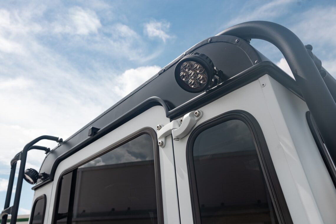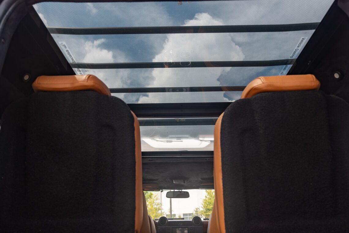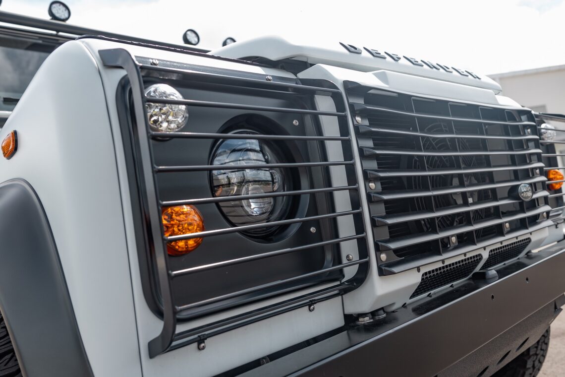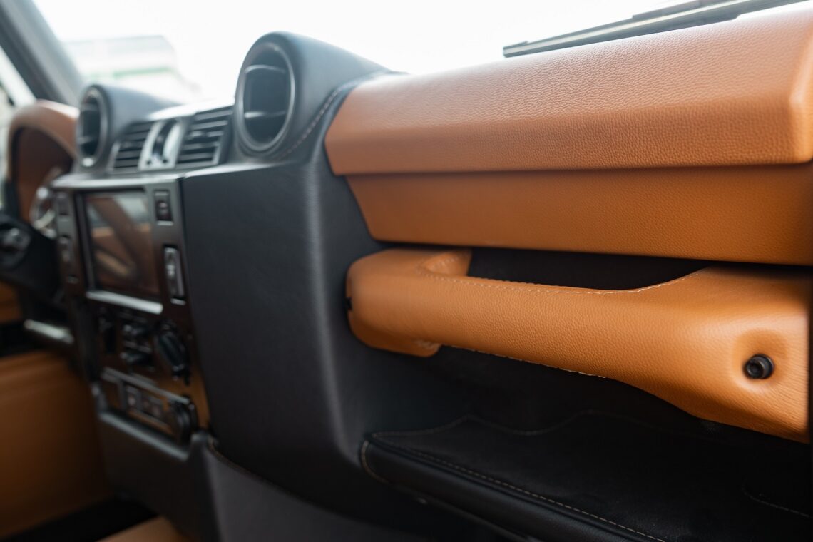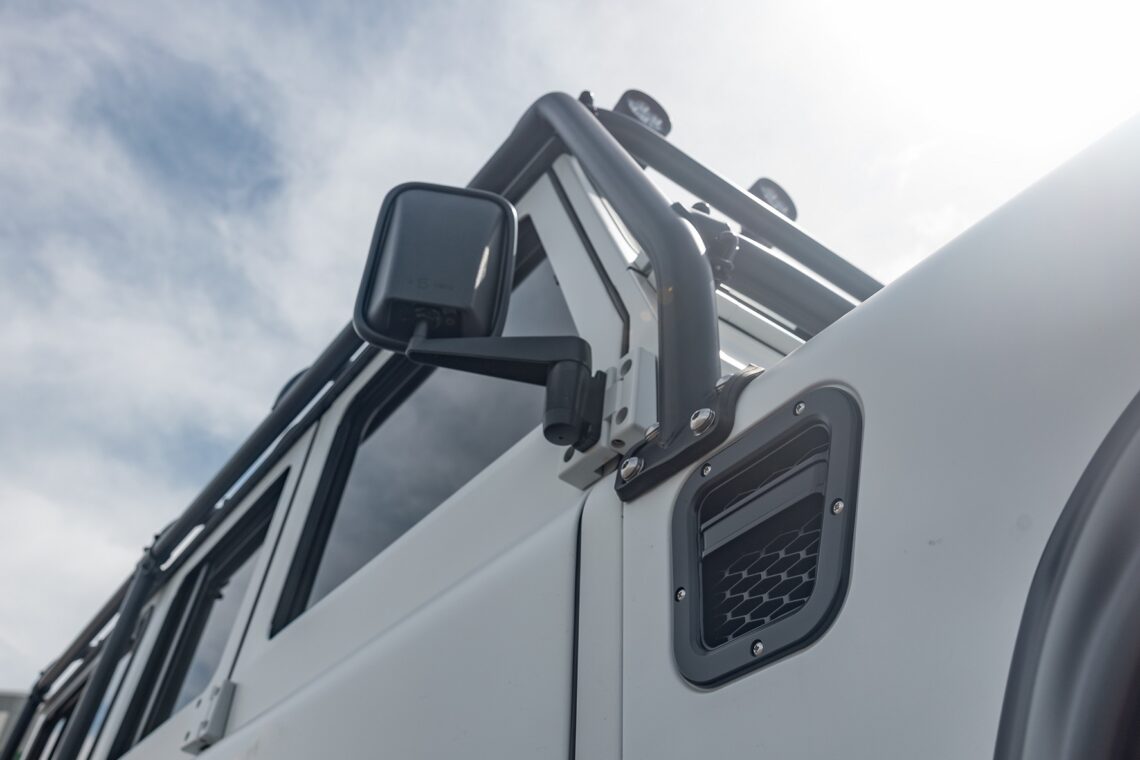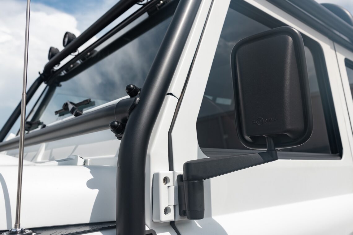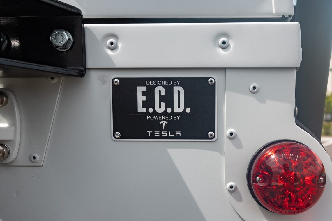This 1989 Defender 110 is codenamed Project Sunrise. It is powered by our 1st gen EV powertrain. Comes painted in a beautiful Fuji white. It is equipped with our custom Air Ride suspension, ALCON brakes in the front only, OEM style set up in the rear. It also comes with 18 Inch Kahn 1983 wheels painted in Black Satin, fitted with BFG All Terrain tires. The interior features Cadence Licorice leather for the dash, with Cadence Spice accents in some areas. The steering wheel is a MOMO Prototipo wrapped in Cadence Spice leather. It seats up to 6 in a (2+2+2) layout. The front seats are Land Rover Classic style seats, and the load area has 2 forward facing jumps with a rear battery box under the seats. The gauges are custom made for the EV system, and the radio is a Kenwood Excelon head unit. Sunrise comes well equipped with features; such as Apple CarPlay, wireless charging, a back up camera and many more modern features.