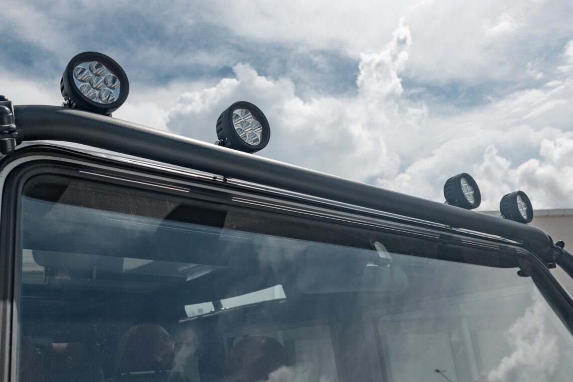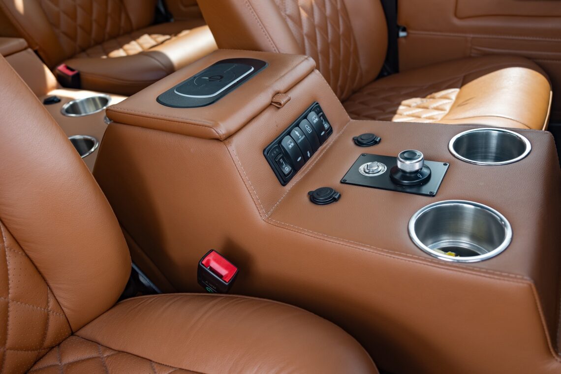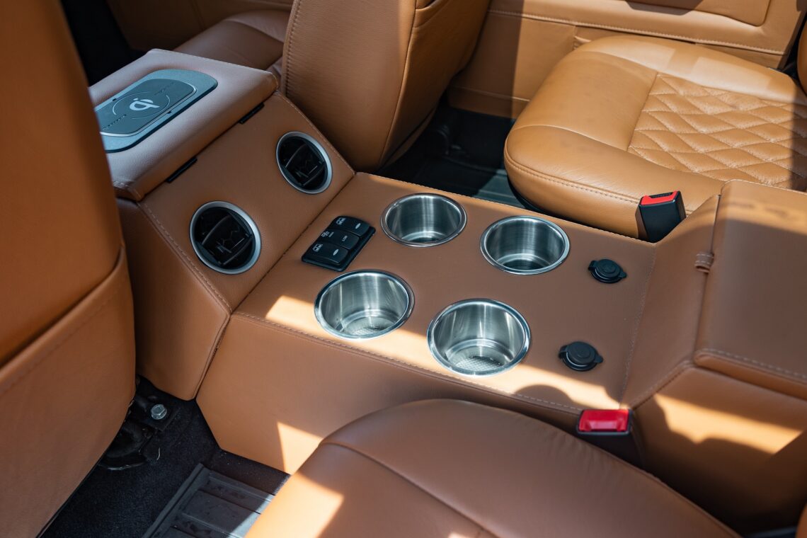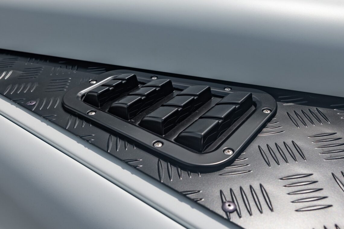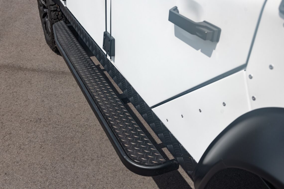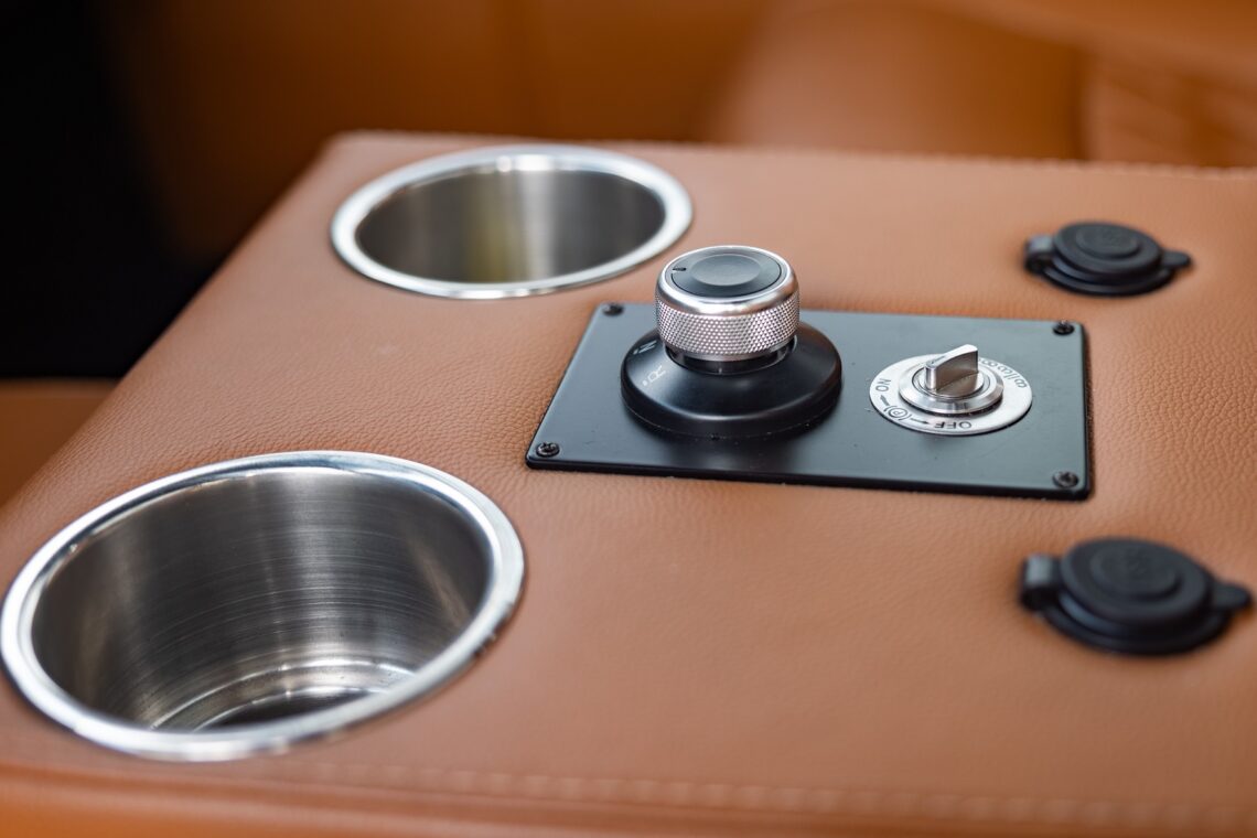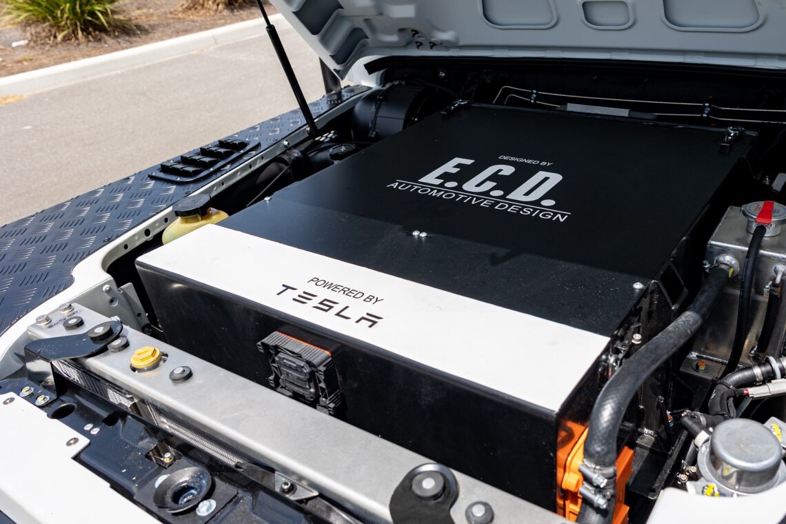 This 1989 Defender 110 is codenamed Project Sunrise. It is powered by our 1st gen EV powertrain. Comes painted in a beautiful Fuji white. It is equipped with our custom Air Ride suspension, ALCON brakes in the front only, OEM style set up in the rear. It also comes with 18 Inch Kahn 1983 wheels painted in Black Satin, fitted with BFG All Terrain tires. The interior features Cadence Licorice leather for the dash, with Cadence Spice accents in some areas. The steering wheel is a MOMO Prototipo wrapped in Cadence Spice leather. It seats up to 6 in a (2+2+2) layout. The front seats are Land Rover Classic style seats, and the load area has 2 forward facing jumps with a rear battery box under the seats. The gauges are custom made for the EV system, and the radio is a Kenwood Excelon head unit. Sunrise comes well equipped with features; such as Apple CarPlay, wireless charging, a back up camera and many more modern features.