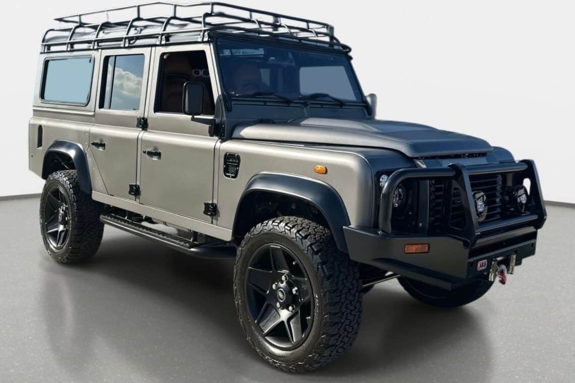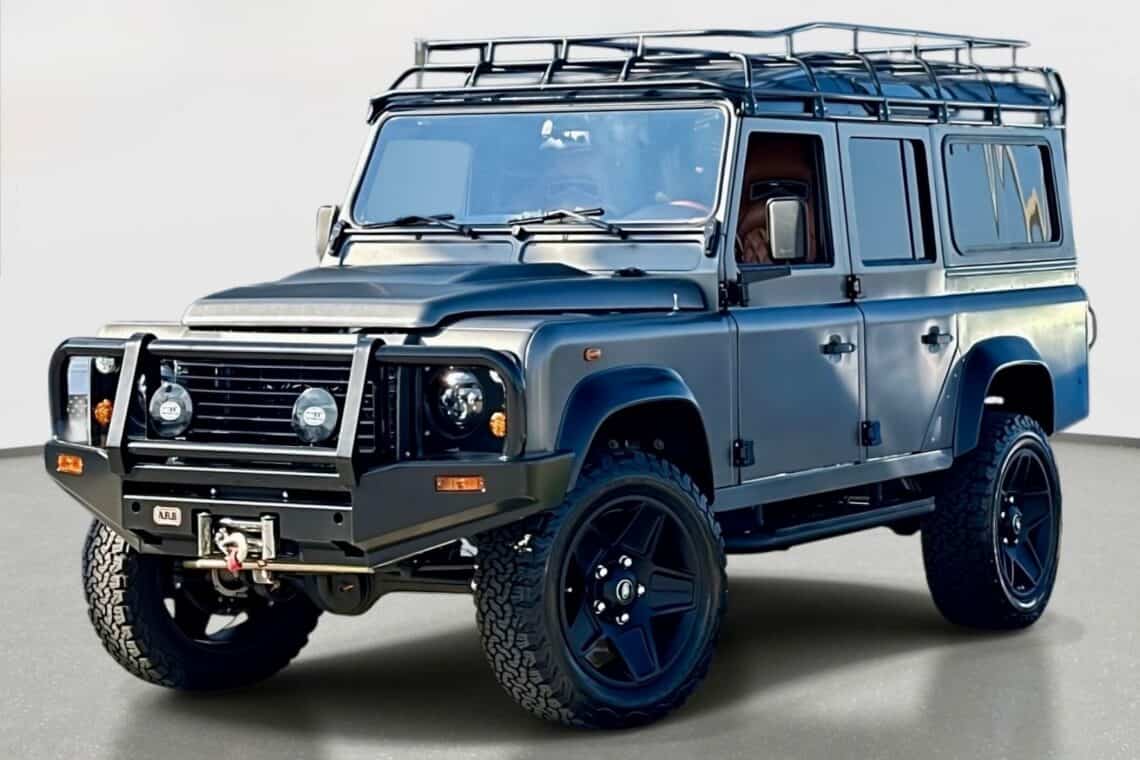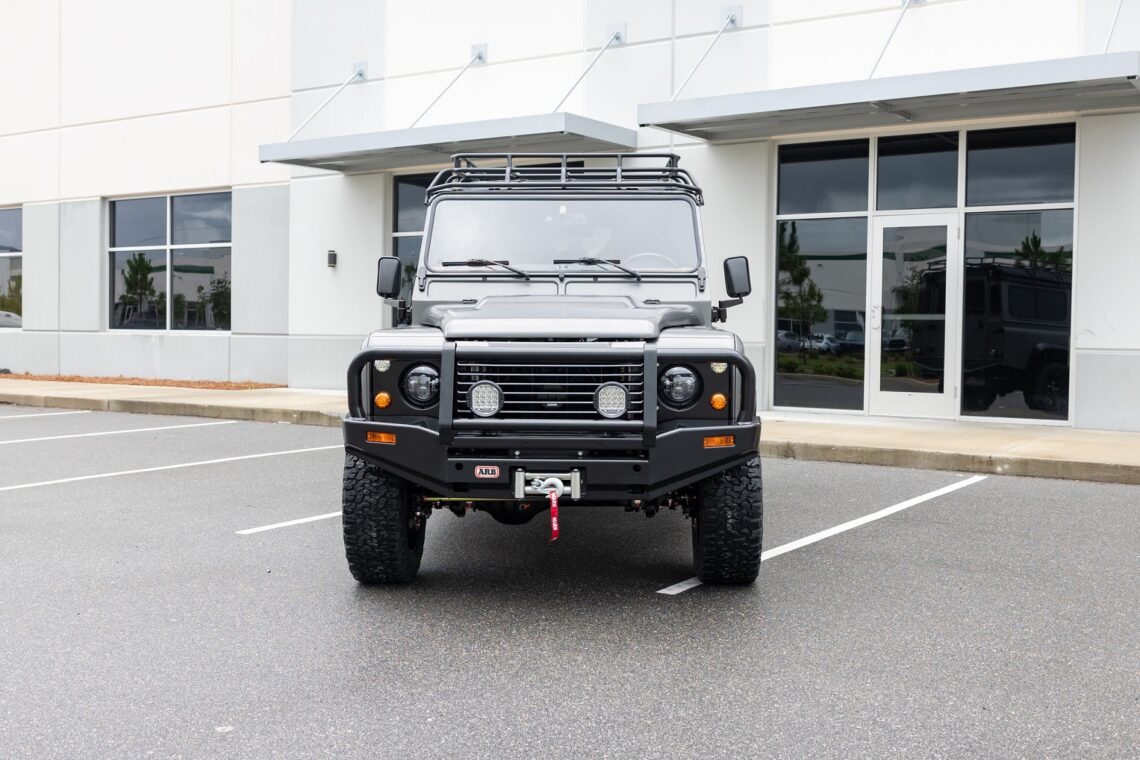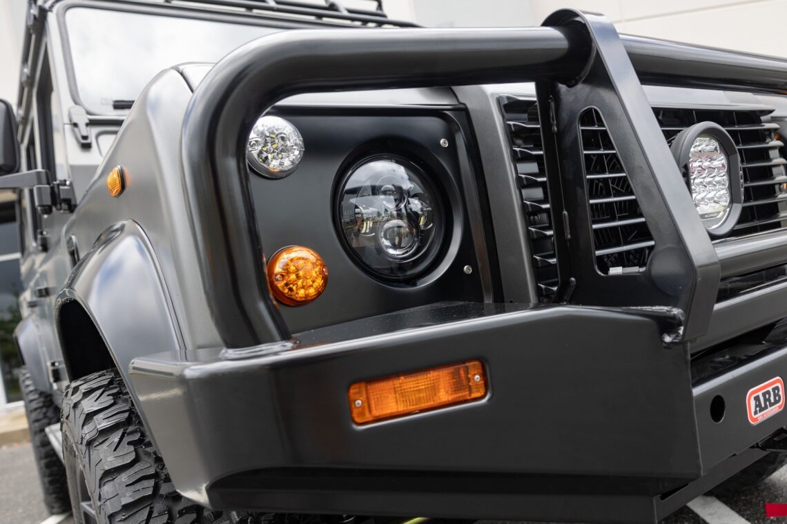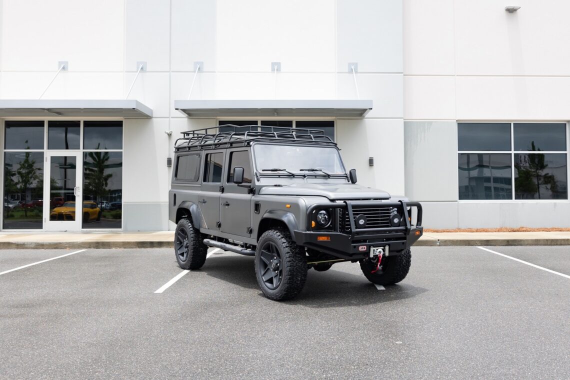 This custom ECD Defender 110 build is known as Project Cyclone! It is finished in Gunmetal Gray in Eggshell finish, powered by an LT1 V8 and is paired to an 10 speed Automatic transmission. This Defender is enhanced by a 6-point roll cage , 20 Inch Kahn Mondial Retro painted in Satin Black and wrapped in BFG all-terrain tires and has the EBC fast brakes. Project Cyclone also include our custom ECD air ride suspension system. The interior features the Puma dash wrapped in Amalfi Black and Tan leather. Also inside you will find the Corbeau Trailcat seats wrapped in Brown leather. This truck also has plenty of modern features such as a touch screen head unit, Apple CarPlay, rear a/c, wireless charging, USB ports throughout and much more. Don’t miss your chance to drive away in this restored defender and experience a customized adventure.