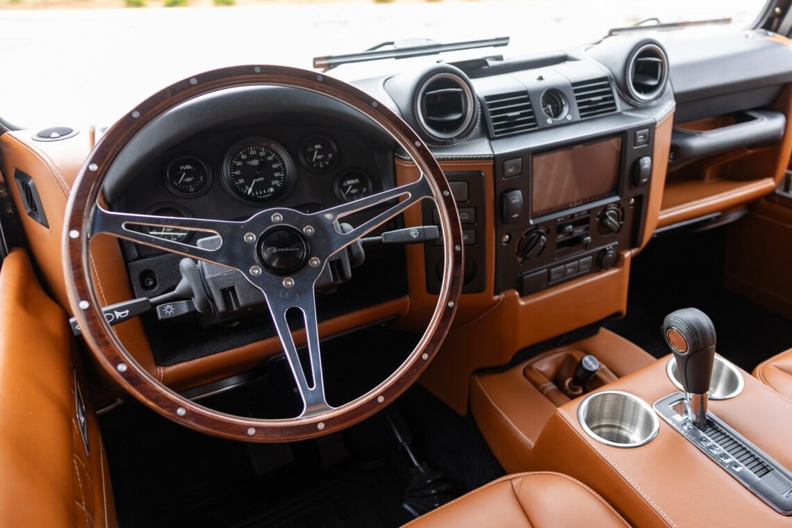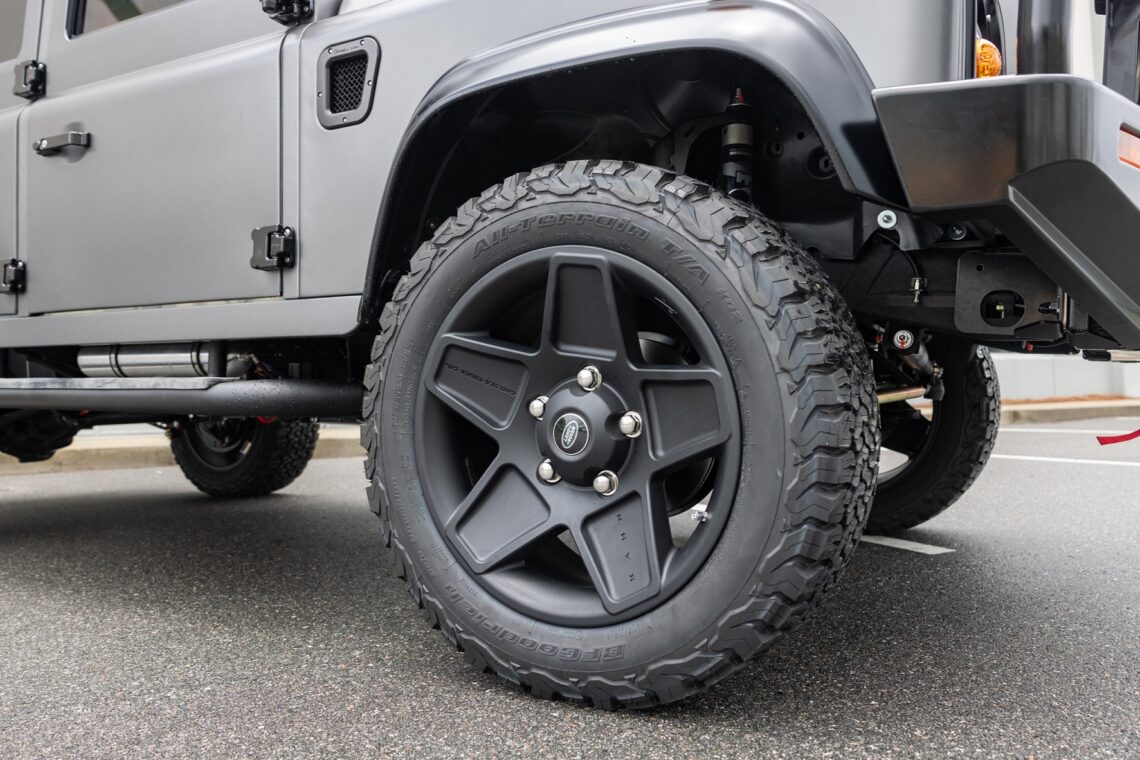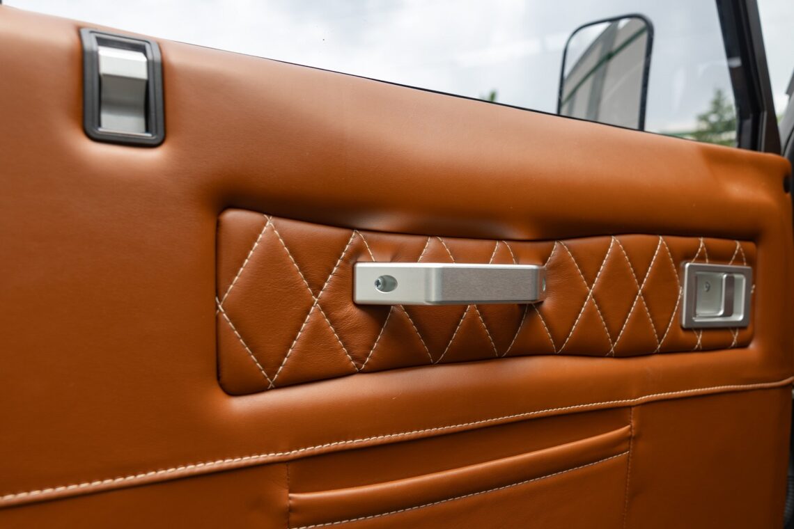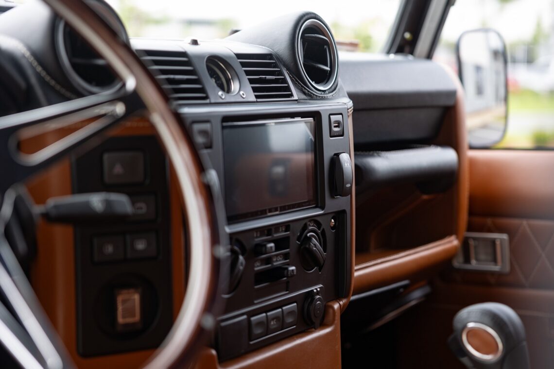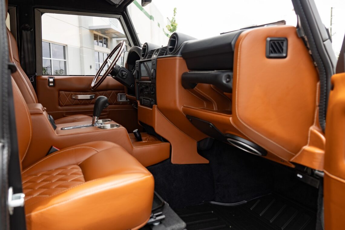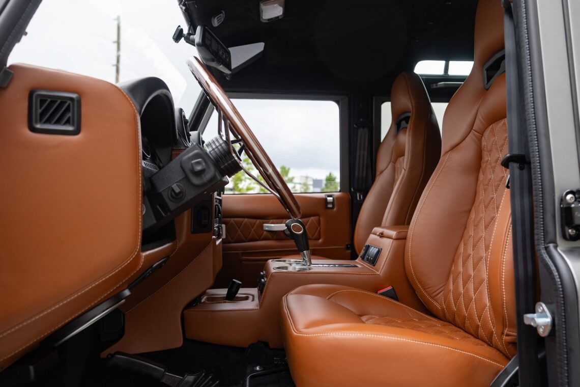 This custom ECD Defender 110 build is known as Project Cyclone! It is finished in Gunmetal Gray in Eggshell finish, powered by an LT1 V8 and is paired to an 10 speed Automatic transmission. This Defender is enhanced by a 6-point roll cage , 20 Inch Kahn Mondial Retro painted in Satin Black and wrapped in BFG all-terrain tires and has the EBC fast brakes. Project Cyclone also include our custom ECD air ride suspension system. The interior features the Puma dash wrapped in Amalfi Black and Tan leather. Also inside you will find the Corbeau Trailcat seats wrapped in Brown leather. This truck also has plenty of modern features such as a touch screen head unit, Apple CarPlay, rear a/c, wireless charging, USB ports throughout and much more. Don’t miss your chance to drive away in this restored defender and experience a customized adventure.