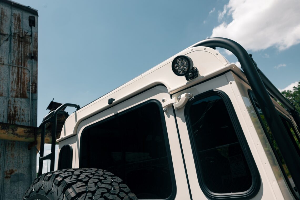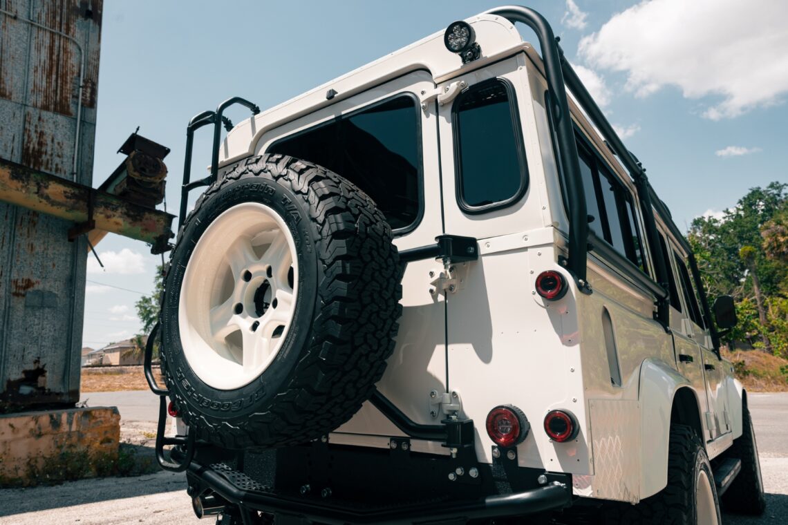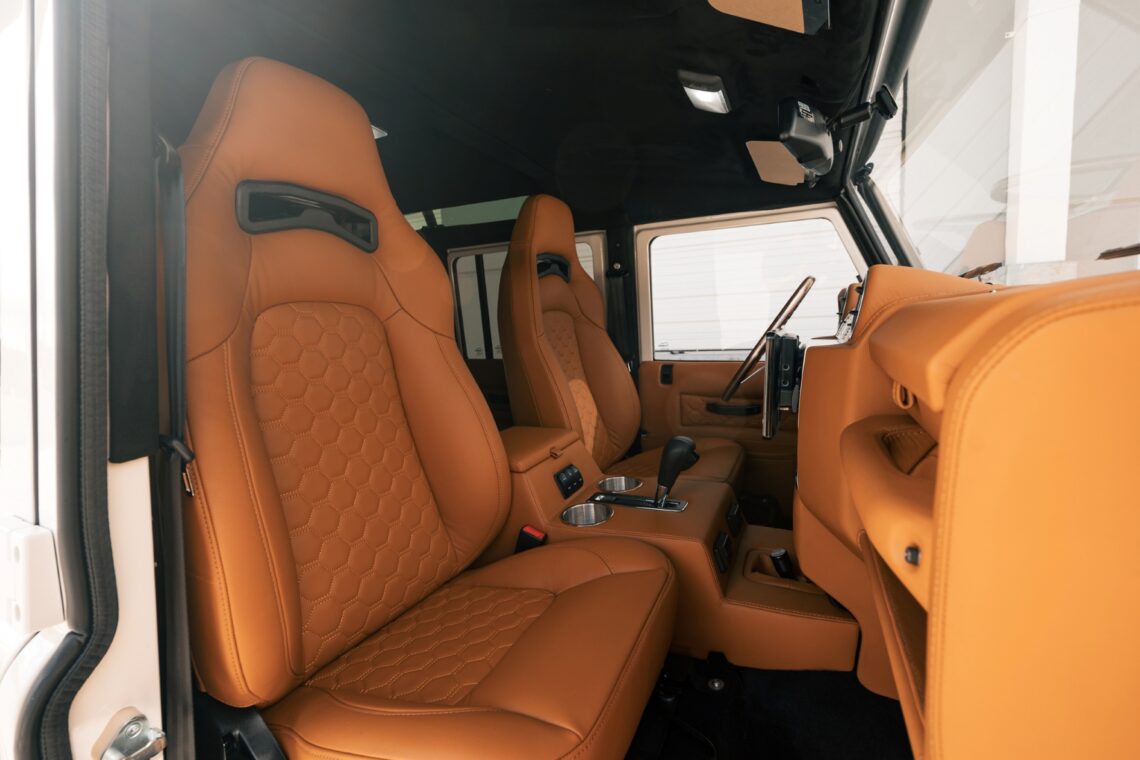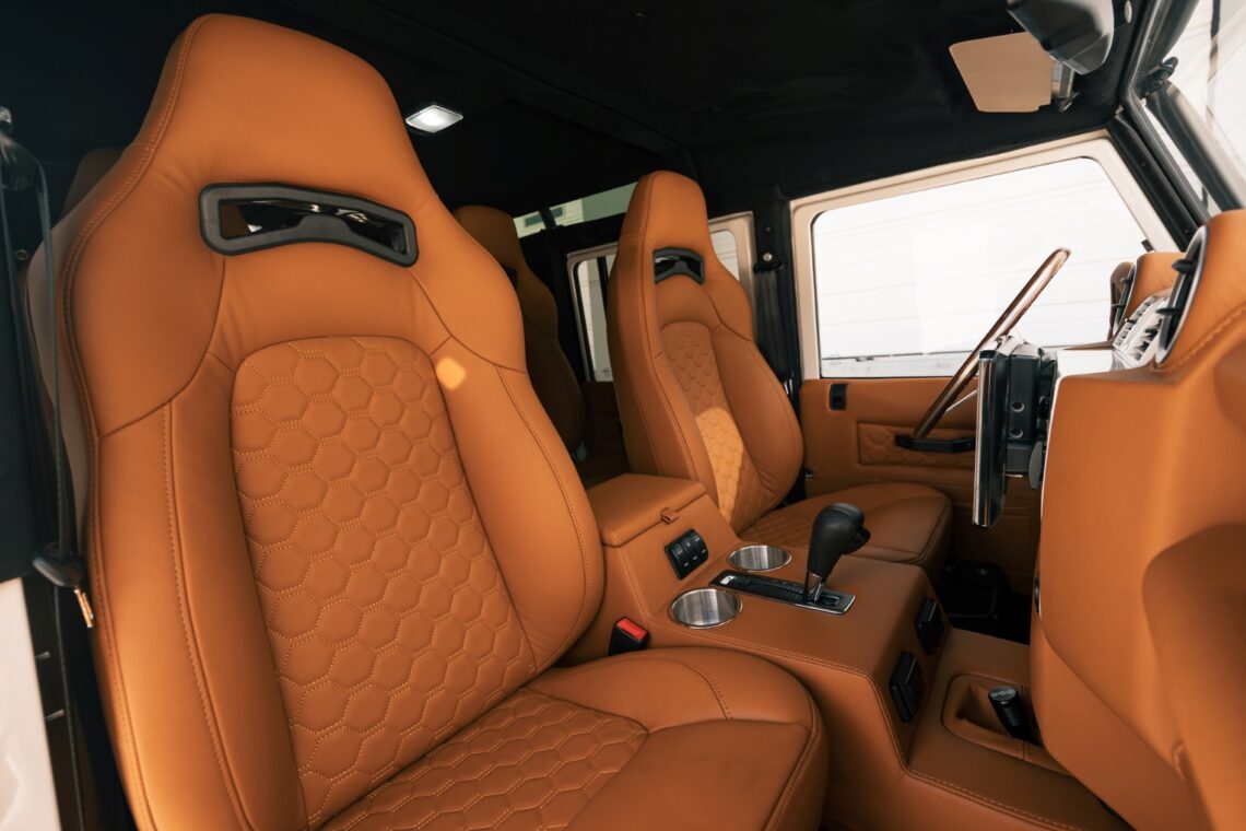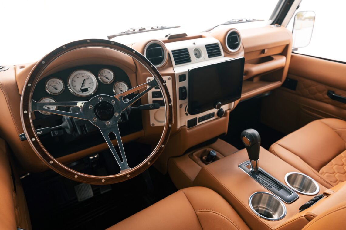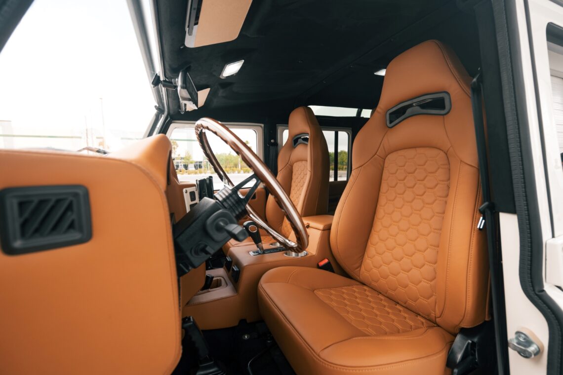 This ECD custom Defender 110 is one of our beautiful creations part of our County Collection! Meet Project Cambridgeshire! Built with a robust 6.2L GM LT1 V8 paired with a 10-speed automatic transmission, it offers a smooth yet powerful driving experience, just what you need for the weekend adventures or your everyday use. Painted in this gorgeous Chawton White paint in full gloss finish, sitting on 18″ Ceradoc wheels, accentuated by a 6 point full external roll cage. This is a truck like no other, that is bound to get some heads turning!