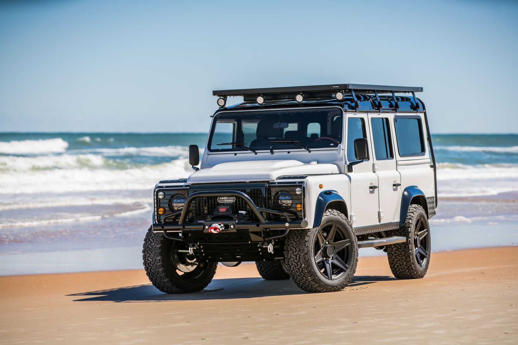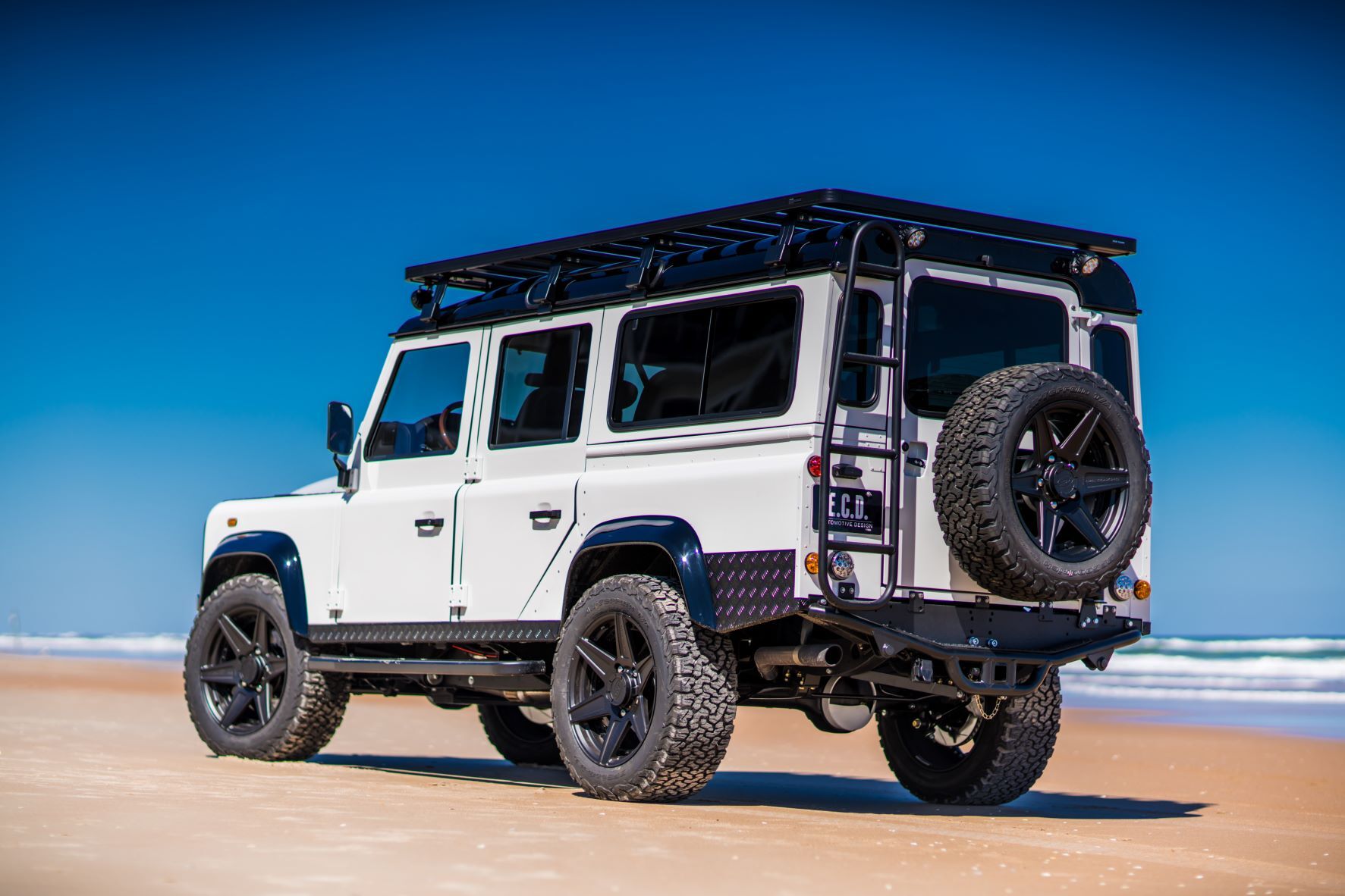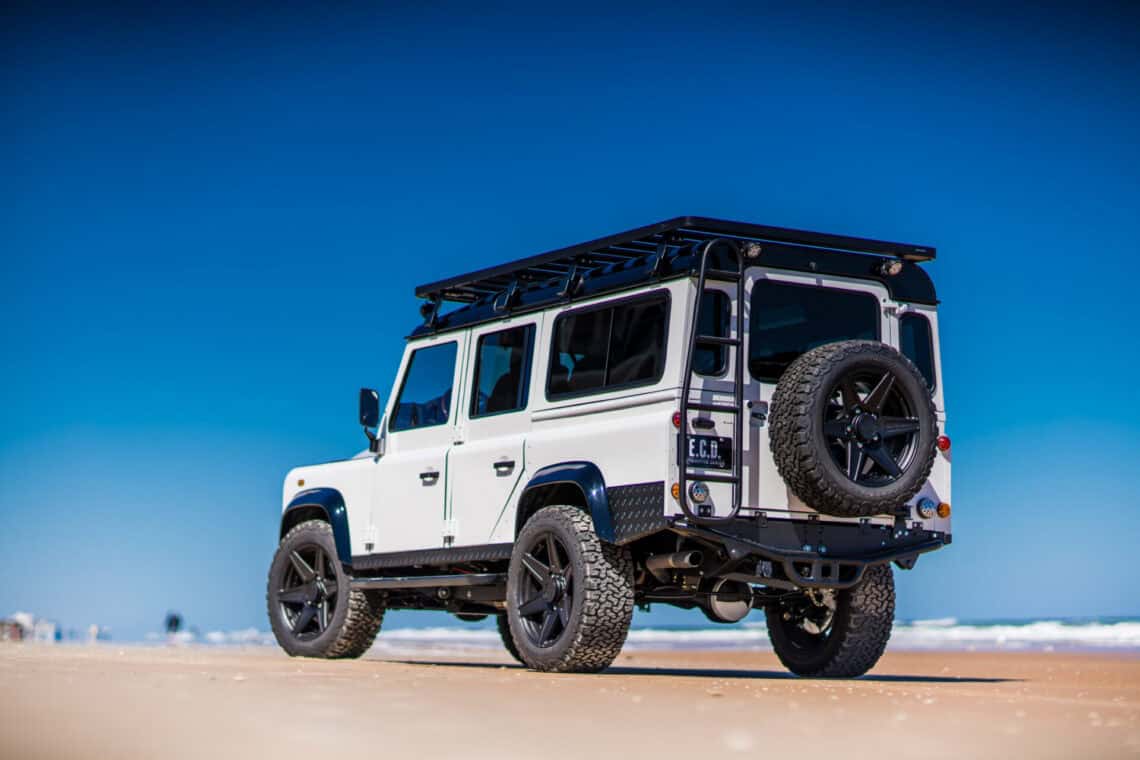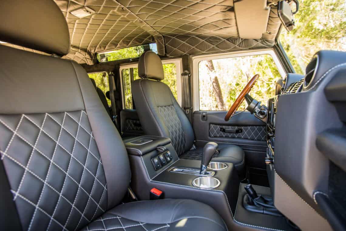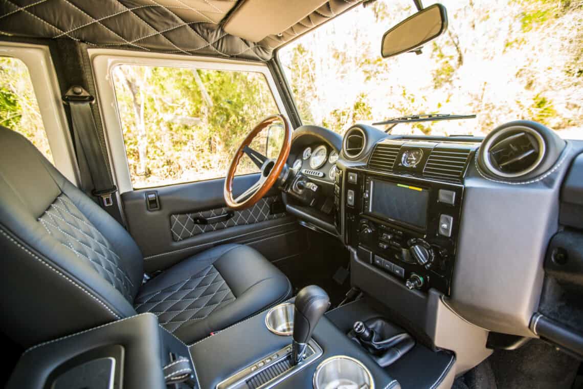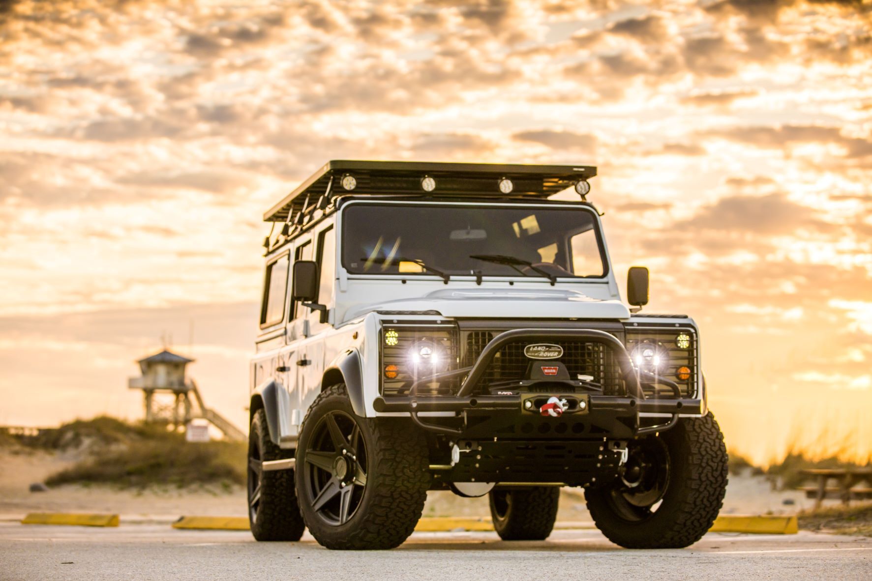 This custom ECD Defender 110 build is known as Project Alpaca! It is finished in Super White gloss and powered by a 6.2L LS3 V8 and it is paired to an automatic transmission. This Defender 110 has 20″ ECD ADV1 custom wheels wrapped in BFGoodrich All-Terrain tires, custom ECD Air suspension, Frontrunner roof rack and a Warn winch. The interior is highlighted by a pair of Puma classic seats in the front with a matching 60/40 bench in the mid row. All seats are wrapped in Nappa Schwarz leather accented by a white diamond stitch design. The interior is also accentuated by the leather wrapped puma dash, a Nardi steering wheel, wireless charging pad, MUD UK glovebox and headliner to match the seats. Other key features to give this truck a modern feel are a Sony infotainment system with Sirius XM, a full JL Audio high end sound system, white faced Classic Instrument gauges, Brembo brakes, and much more.
