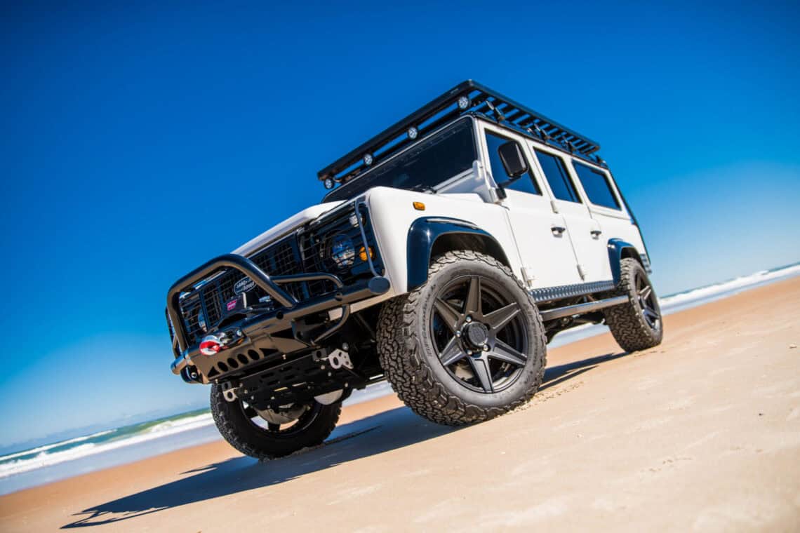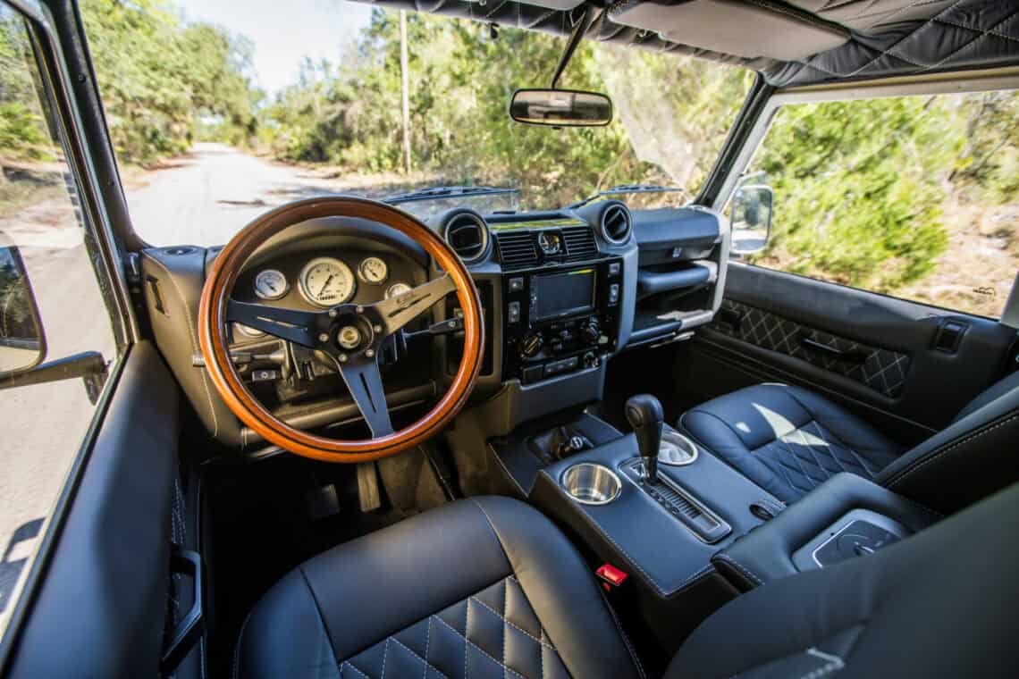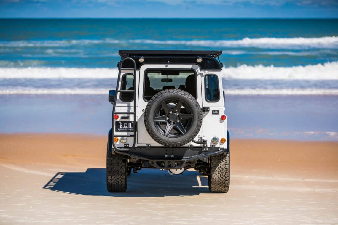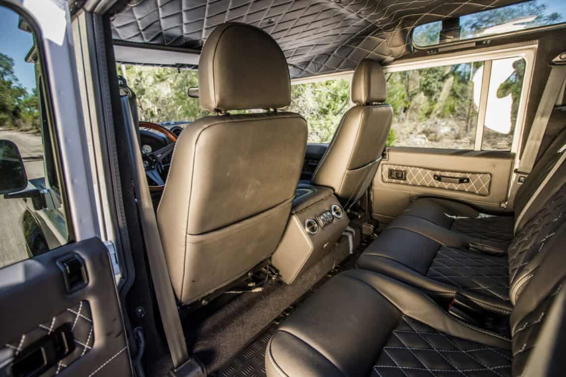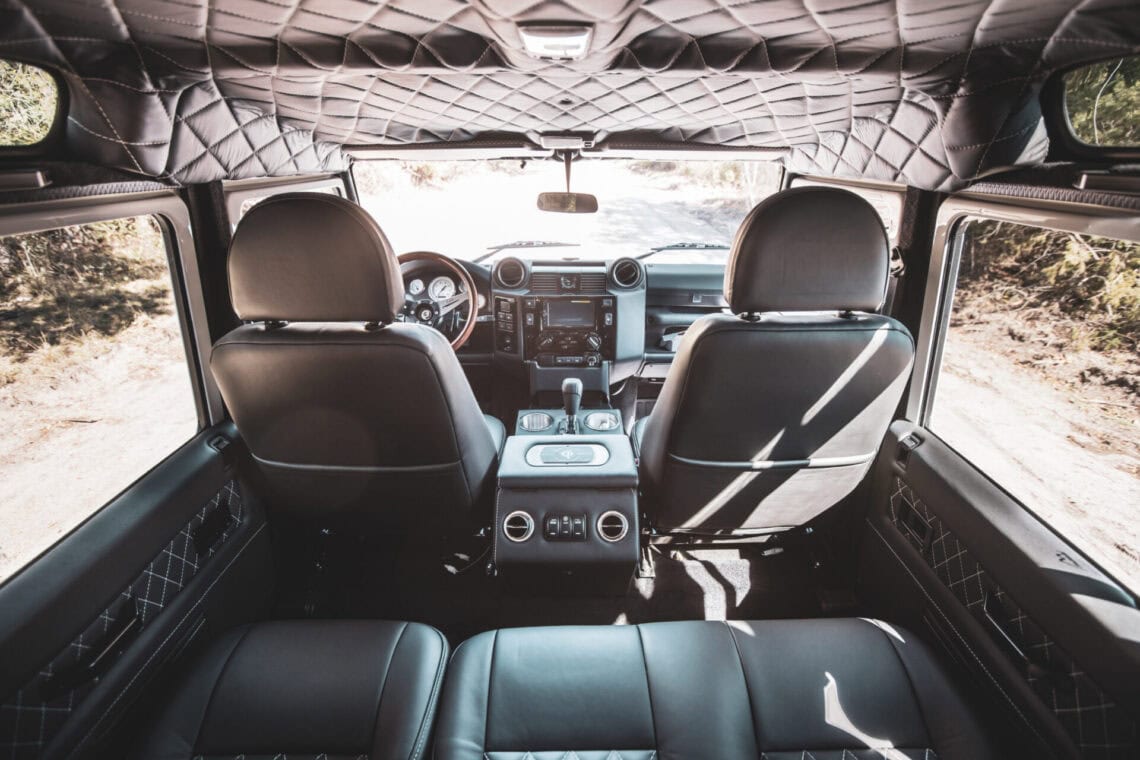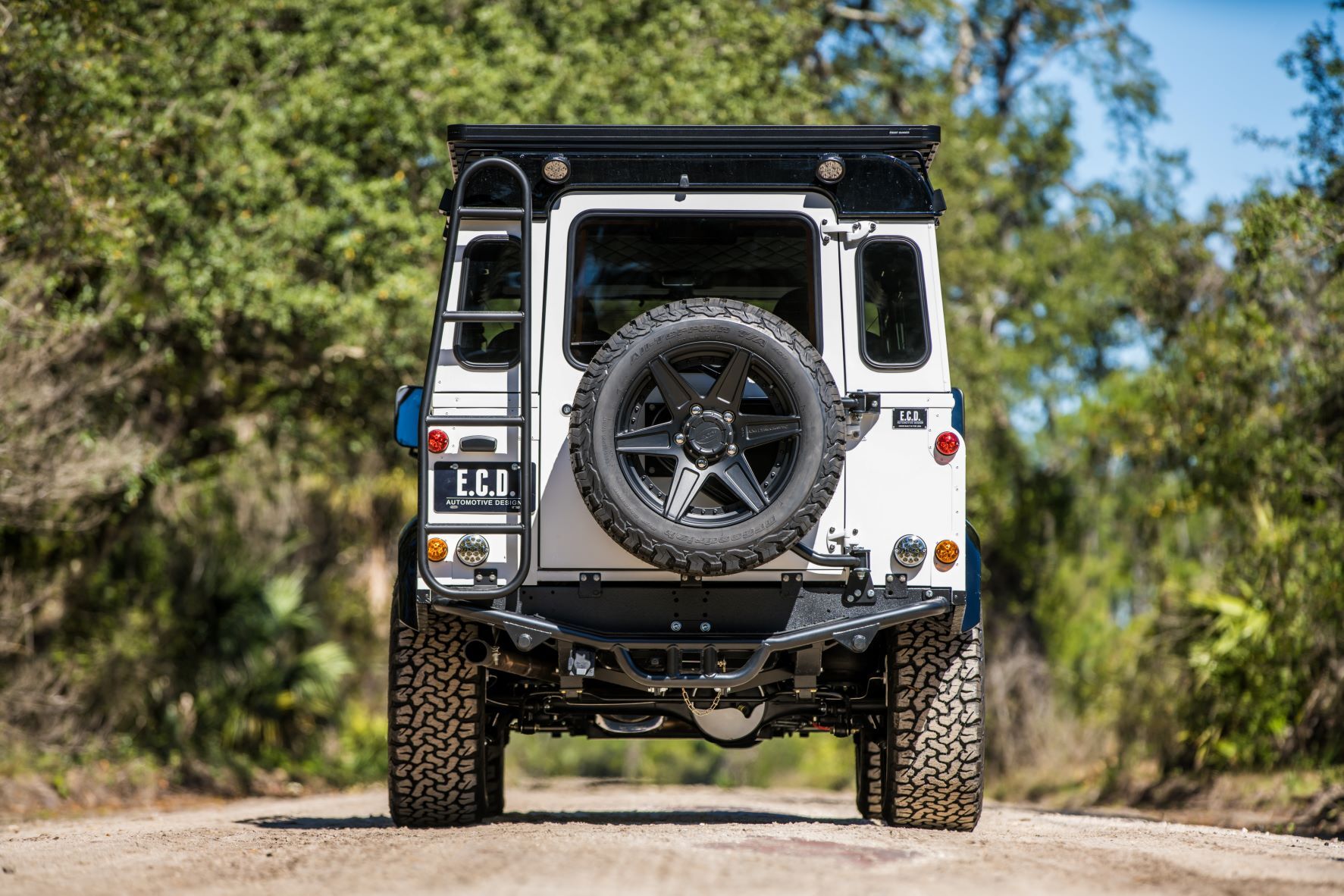 This custom ECD Defender 110 build is known as Project Alpaca! It is finished in Super White gloss and powered by a 6.2L LS3 V8 and it is paired to an automatic transmission. This Defender 110 has 20″ ECD ADV1 custom wheels wrapped in BFGoodrich All-Terrain tires, custom ECD Air suspension, Frontrunner roof rack and a Warn winch. The interior is highlighted by a pair of Puma classic seats in the front with a matching 60/40 bench in the mid row. All seats are wrapped in Nappa Schwarz leather accented by a white diamond stitch design. The interior is also accentuated by the leather wrapped puma dash, a Nardi steering wheel, wireless charging pad, MUD UK glovebox and headliner to match the seats. Other key features to give this truck a modern feel are a Sony infotainment system with Sirius XM, a full JL Audio high end sound system, white faced Classic Instrument gauges, Brembo brakes, and much more.