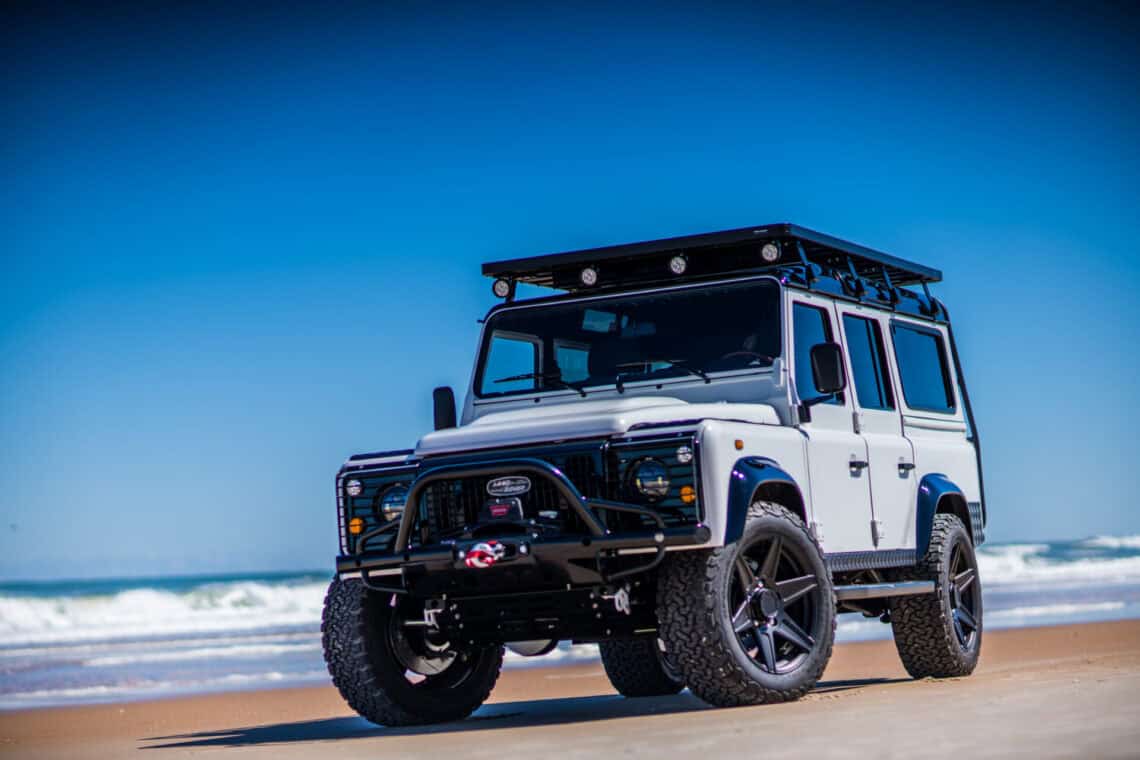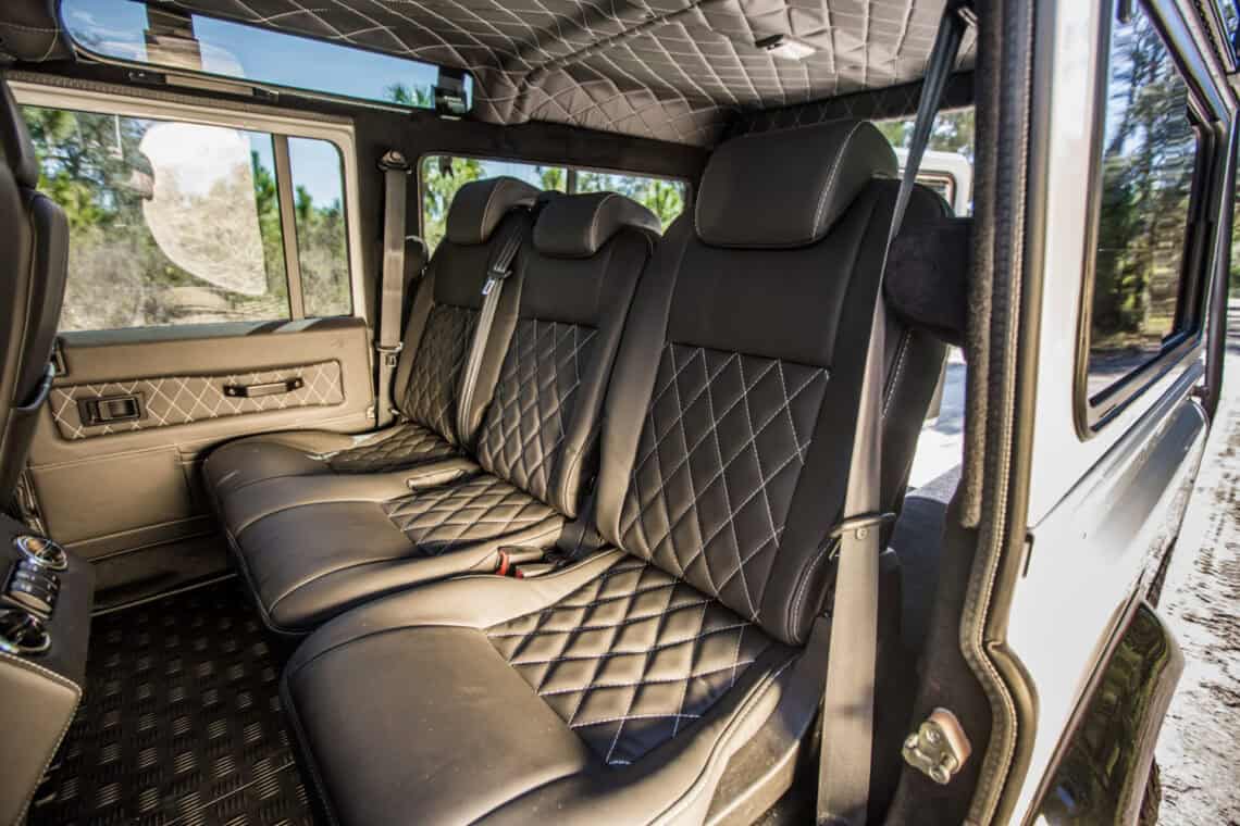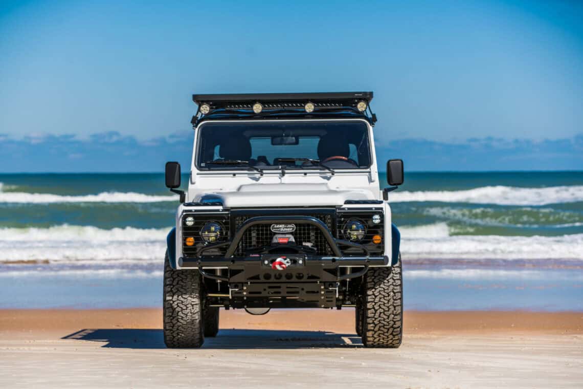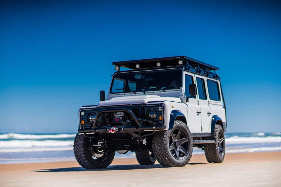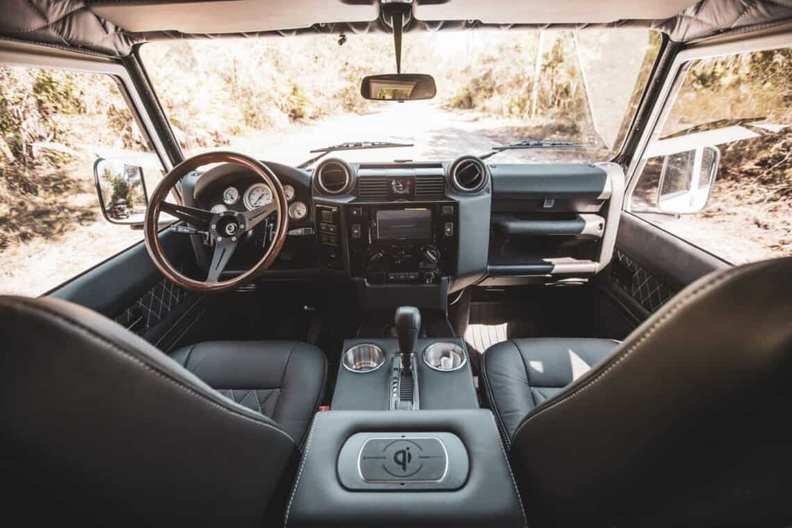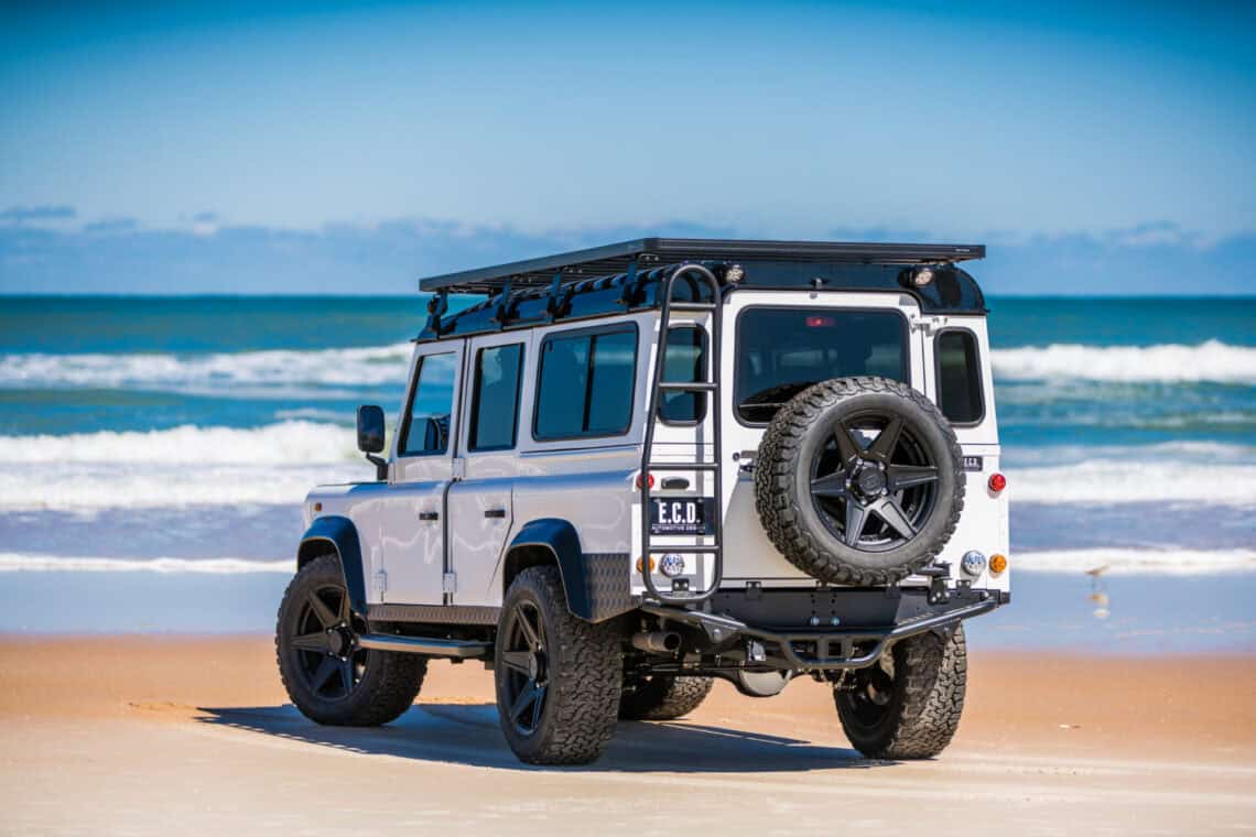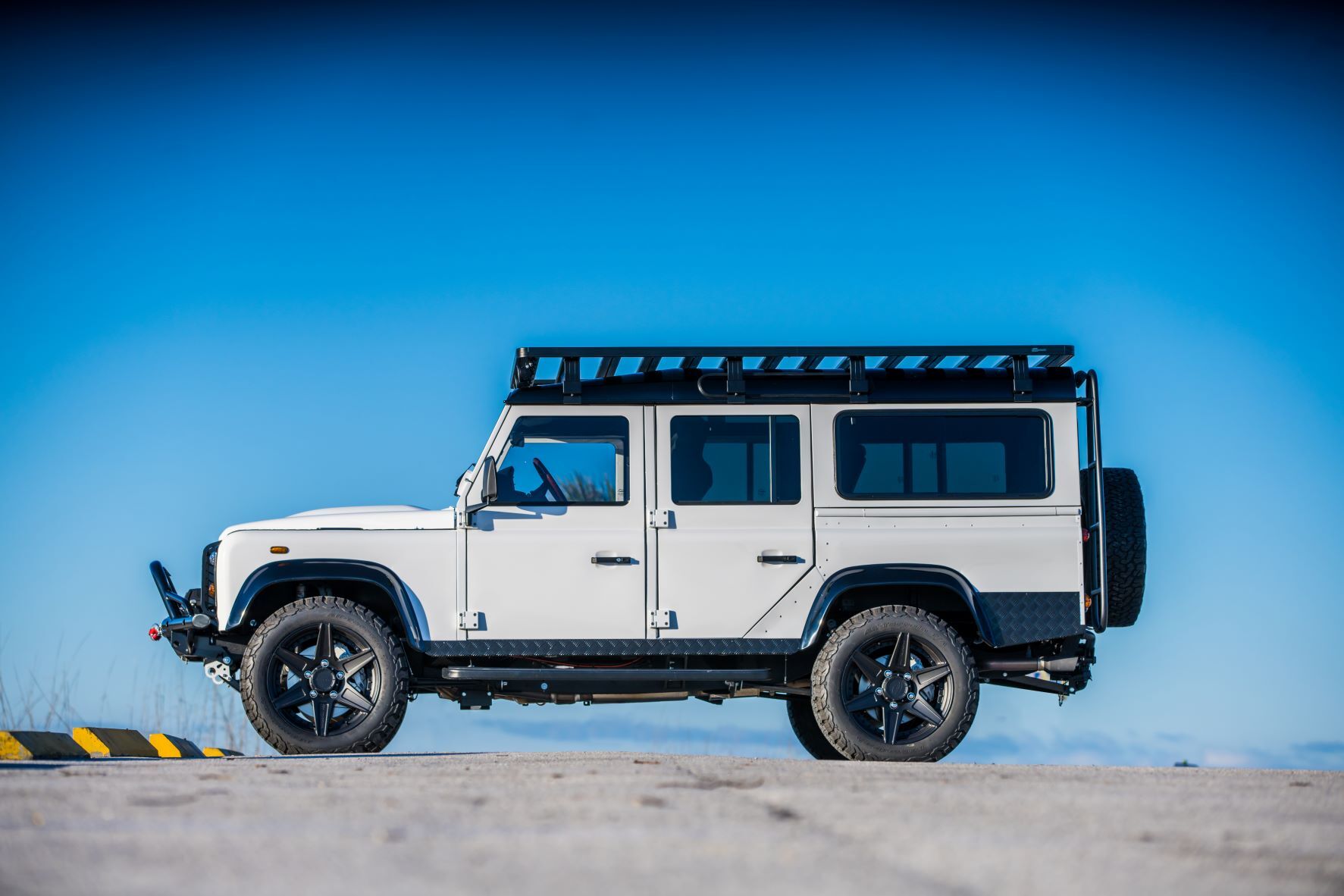 This custom ECD Defender 110 build is known as Project Alpaca! It is finished in Super White gloss and powered by a 6.2L LS3 V8 and it is paired to an automatic transmission. This Defender 110 has 20″ ECD ADV1 custom wheels wrapped in BFGoodrich All-Terrain tires, custom ECD Air suspension, Frontrunner roof rack and a Warn winch. The interior is highlighted by a pair of Puma classic seats in the front with a matching 60/40 bench in the mid row. All seats are wrapped in Nappa Schwarz leather accented by a white diamond stitch design. The interior is also accentuated by the leather wrapped puma dash, a Nardi steering wheel, wireless charging pad, MUD UK glovebox and headliner to match the seats. Other key features to give this truck a modern feel are a Sony infotainment system with Sirius XM, a full JL Audio high end sound system, white faced Classic Instrument gauges, Brembo brakes, and much more.